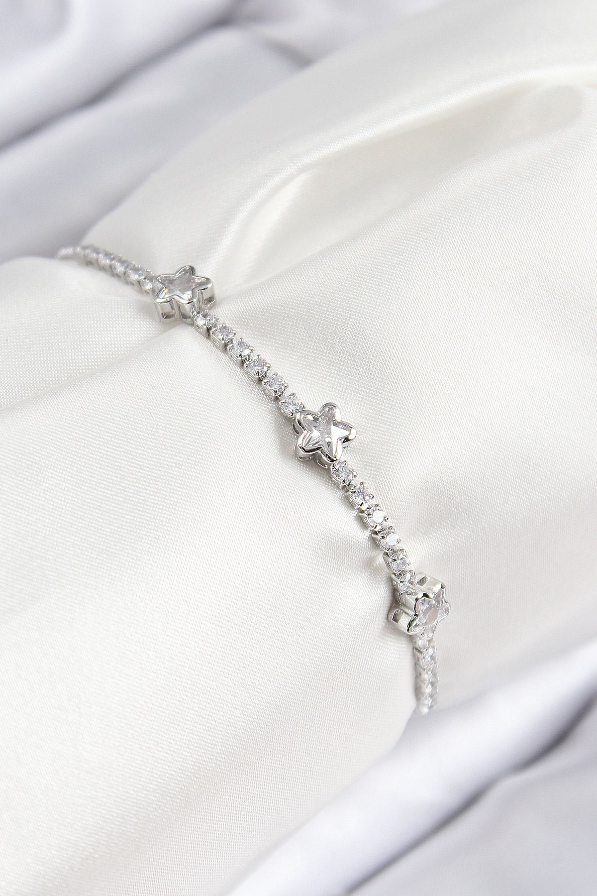 Pirinç Zirkon Taşlı Yıldız Model Gümüş Renk Asansörlü Kadın Bileklik - TJ-BB7736
