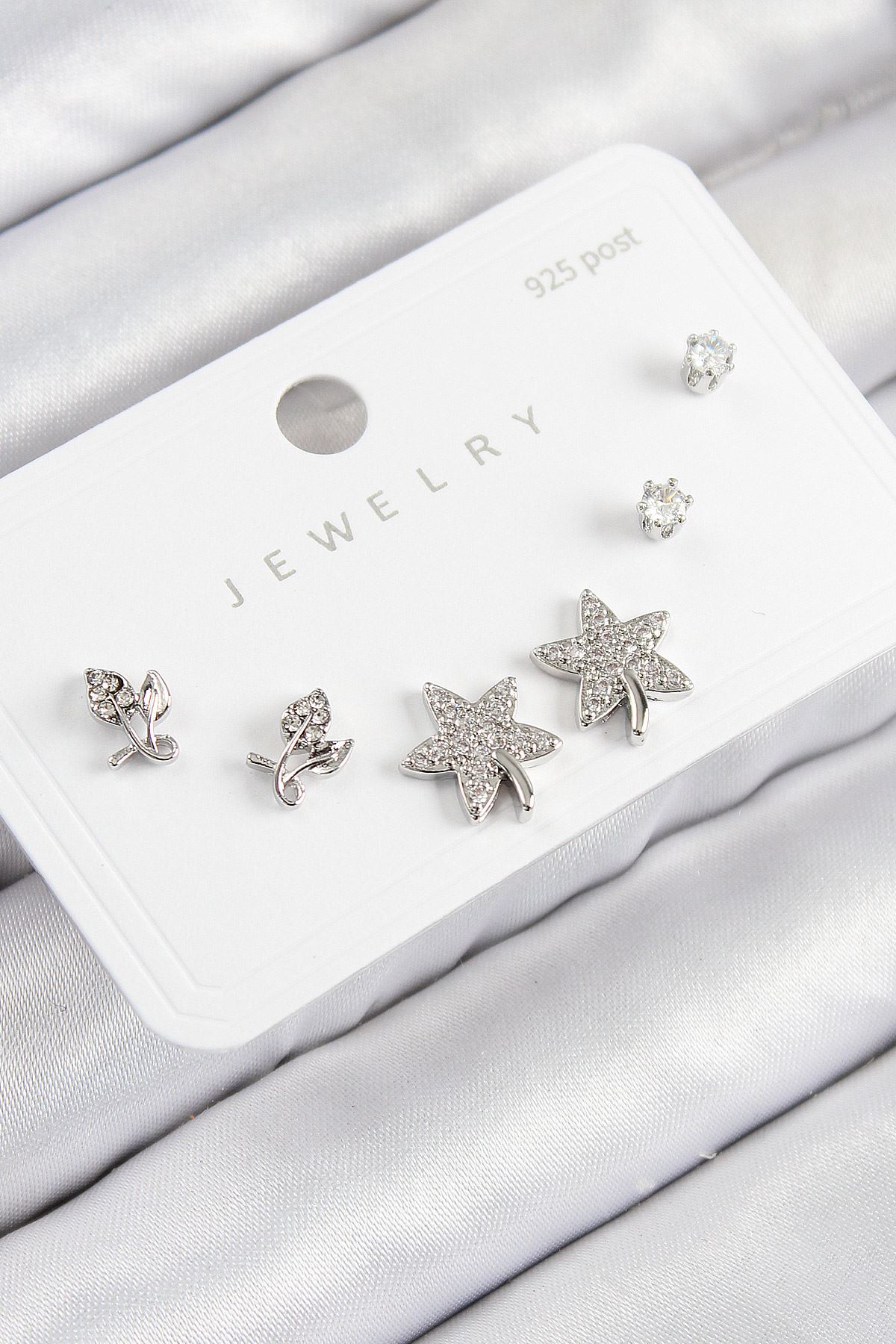 Pirinç Zirkon Taşlı Yıldız Ve Gül Model Gümüş Renk 925 Ayar Gümüş Çivi Kadın Küpe Set - TJ-BKP11179