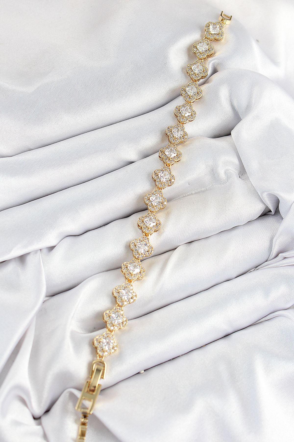 Pirinç Zirkon Taşlı Yonca Baget Model Gold Renk VIP Seri Kadın Bileklik - TJ-BB7510