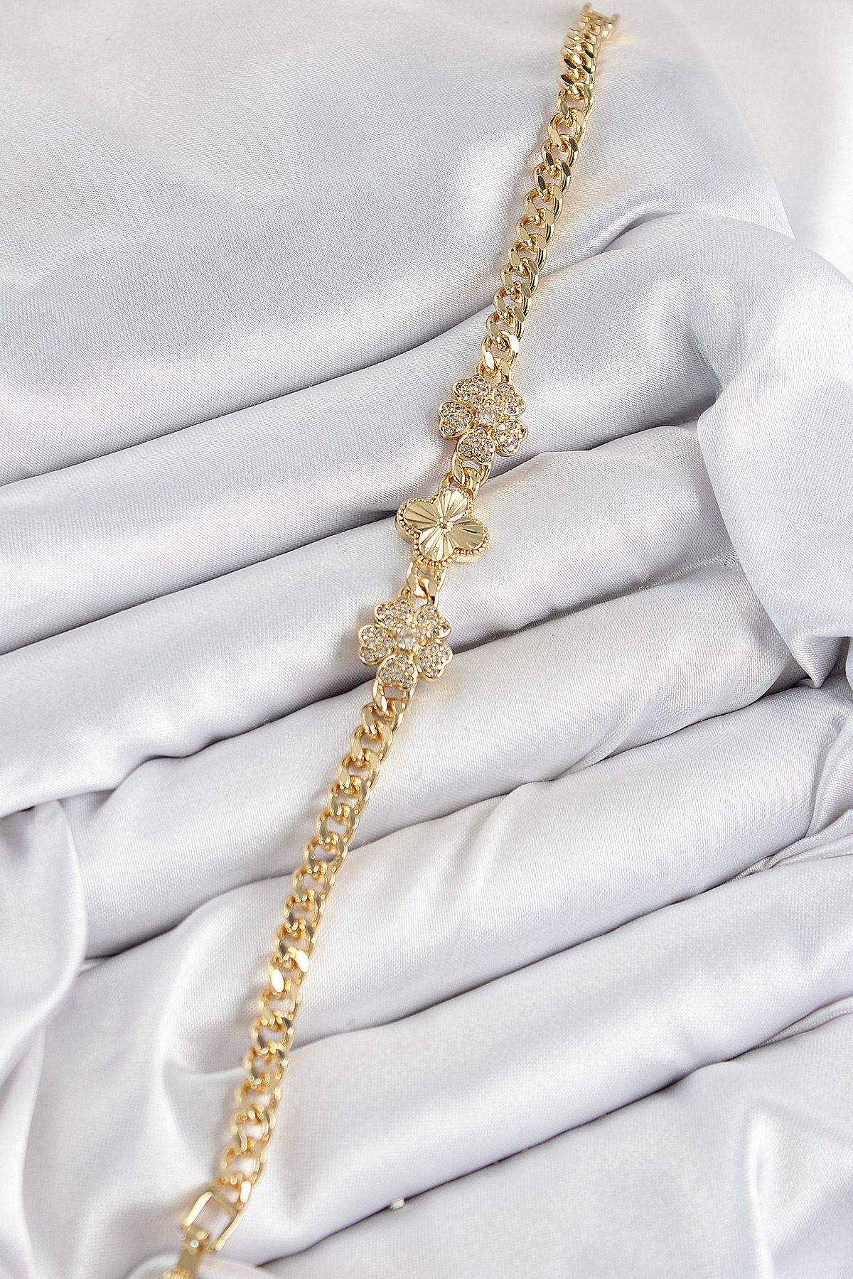 Pirinç Zirkon Taşlı Yonca Model Gold Renk Kadın Bileklik - TJ-BB7557