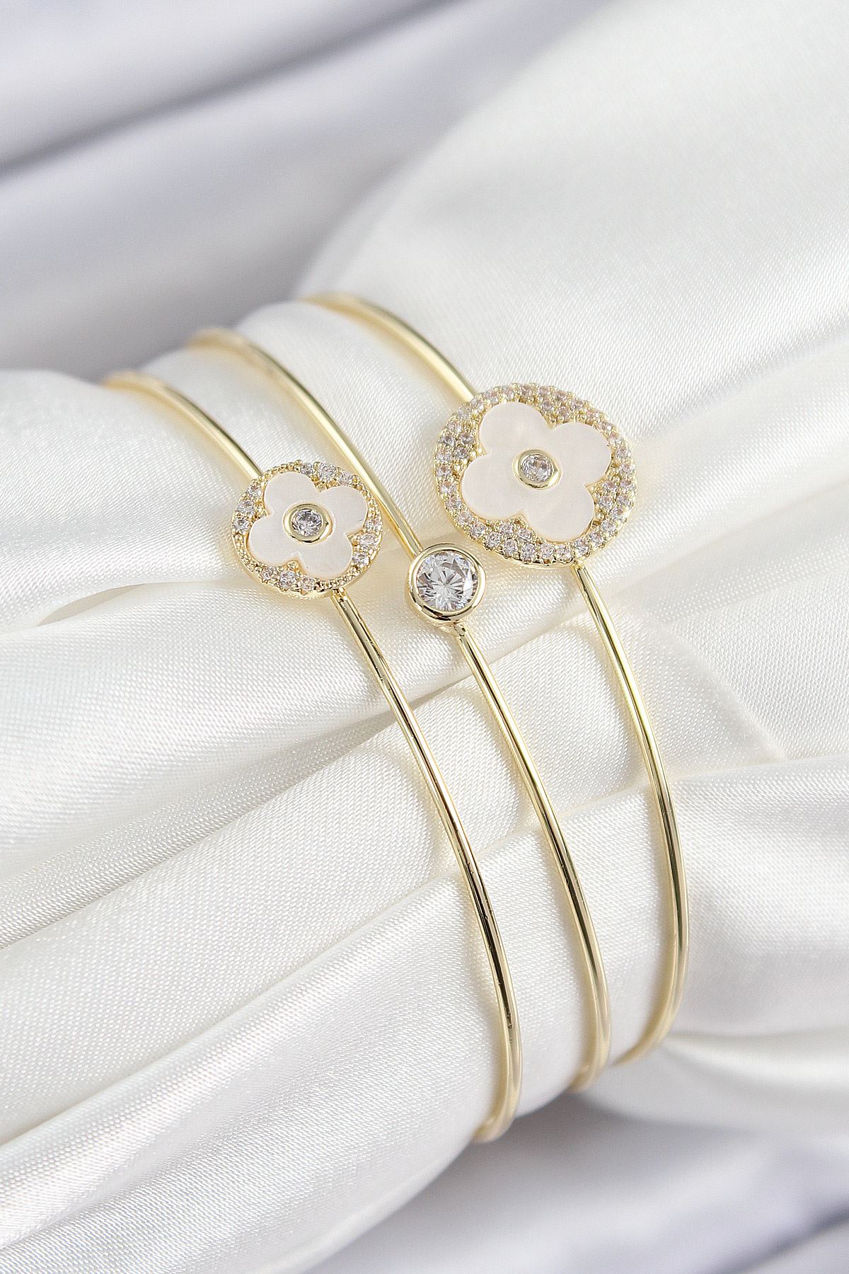Pirinç Zirkon Taşlı Yonca Model Gold Renk Vip 3'lü Kadın Bileklik - TJ-BB7336