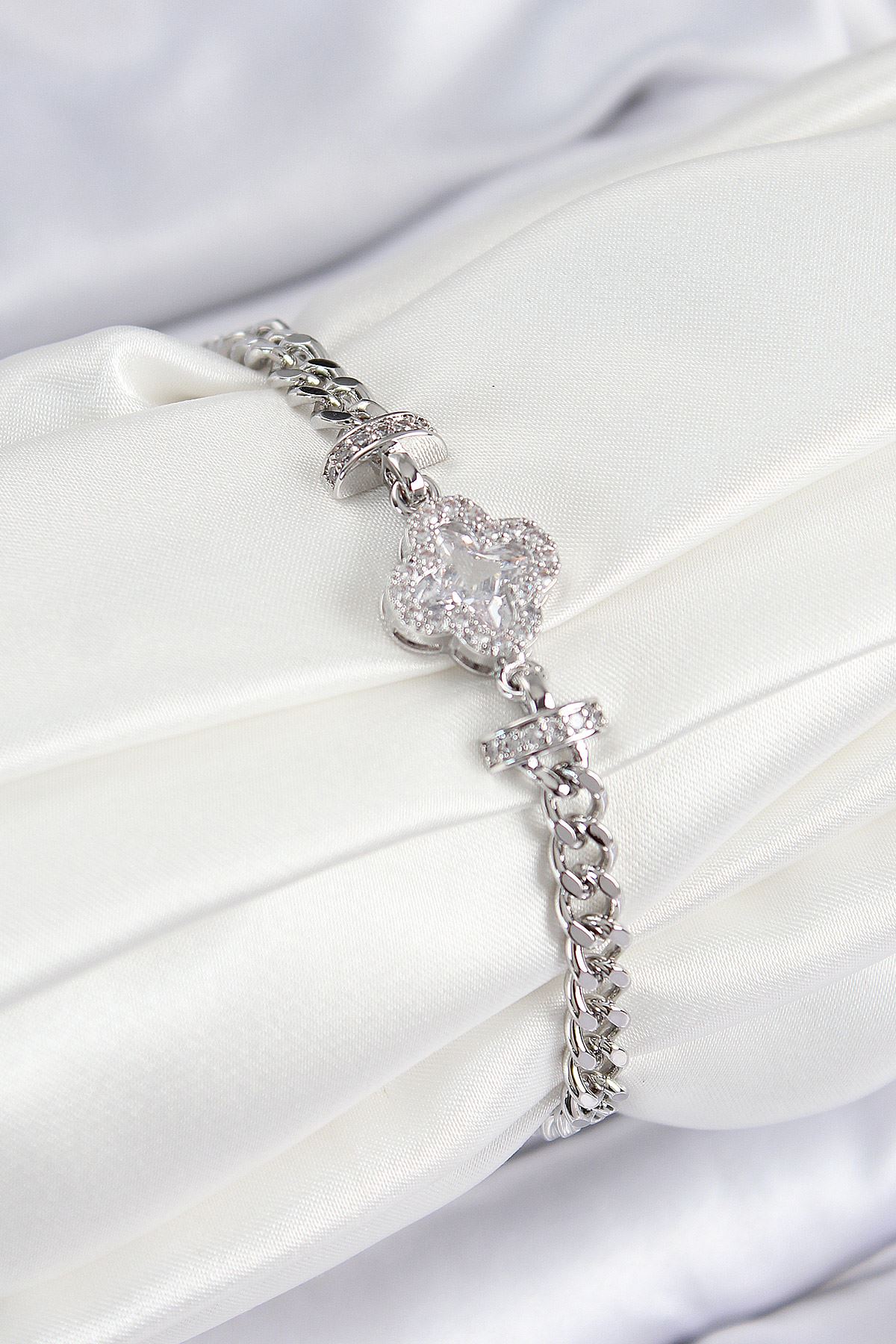 Pirinç Zirkon Taşlı Yonca Model Gümüş Renk Kadın Bileklik - TJ-BB7538