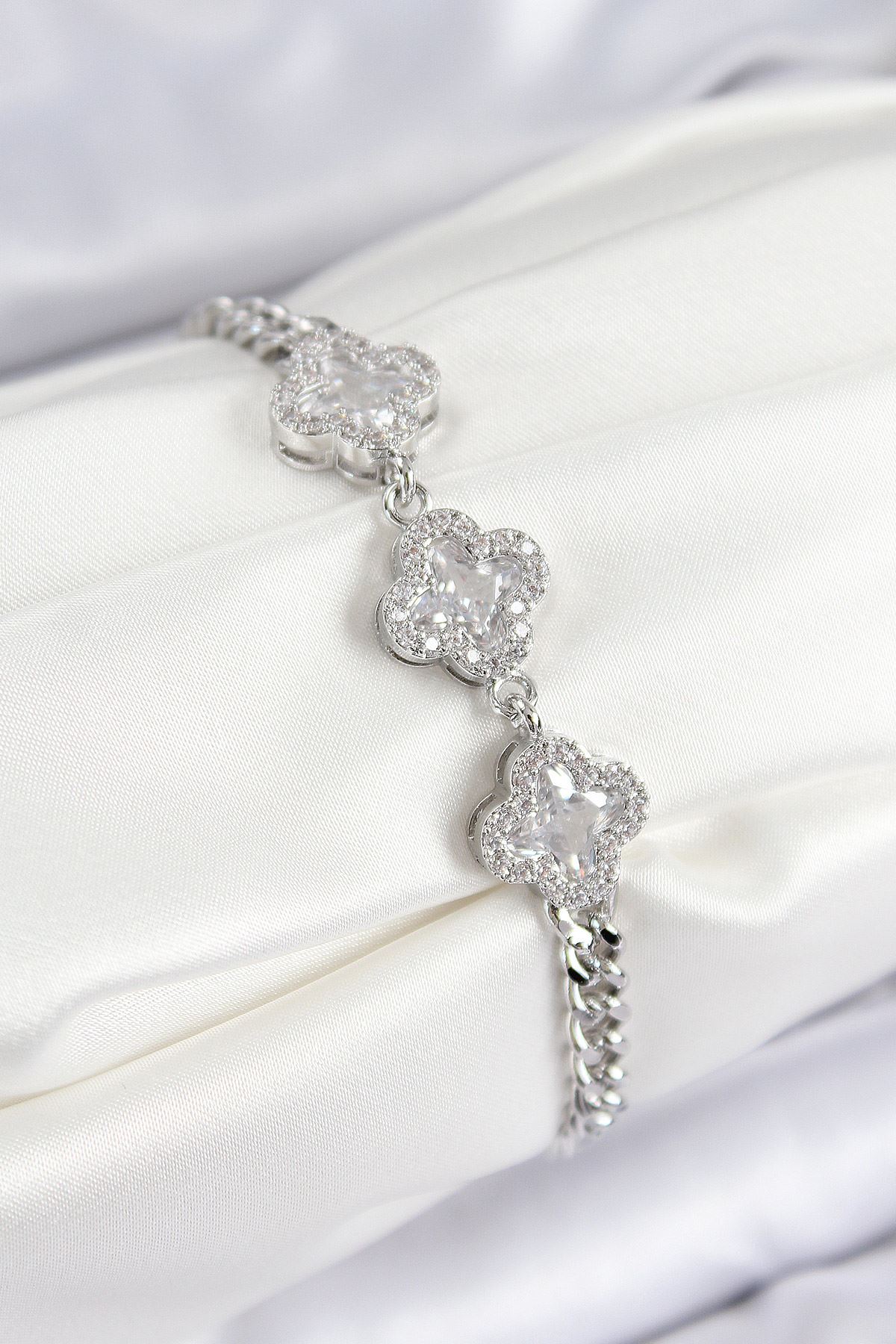 Pirinç Zirkon Taşlı Yonca Model Gümüş Renk Kadın Bileklik - TJ-BB7546