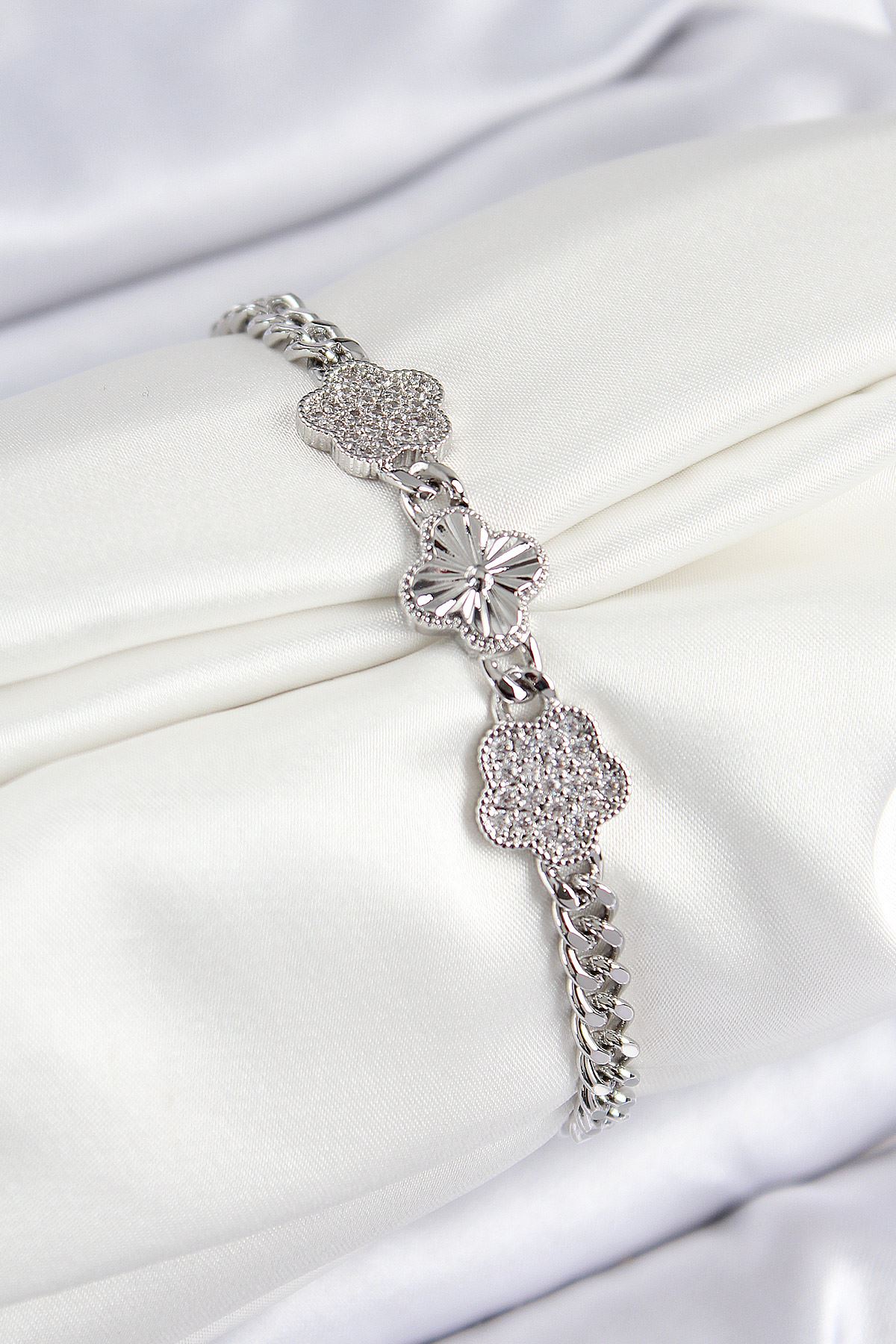 Pirinç Zirkon Taşlı Yonca Model Gümüş Renk Kadın Bileklik - TJ-BB7548