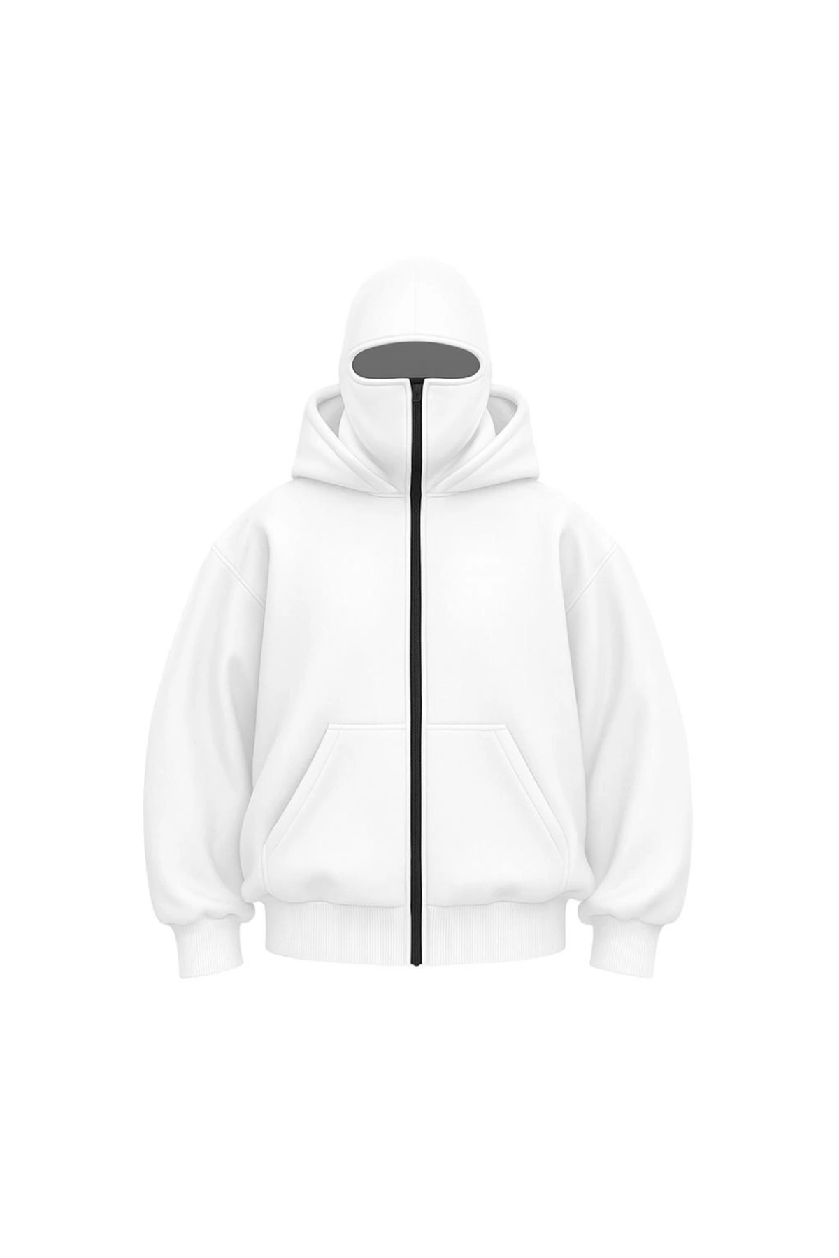 Samuray Ninja Çift Kapşonlu ZIP Fermuarlı Kanguru Çepli Hoodie Maske Detaylı Swetshirt - Beyaz