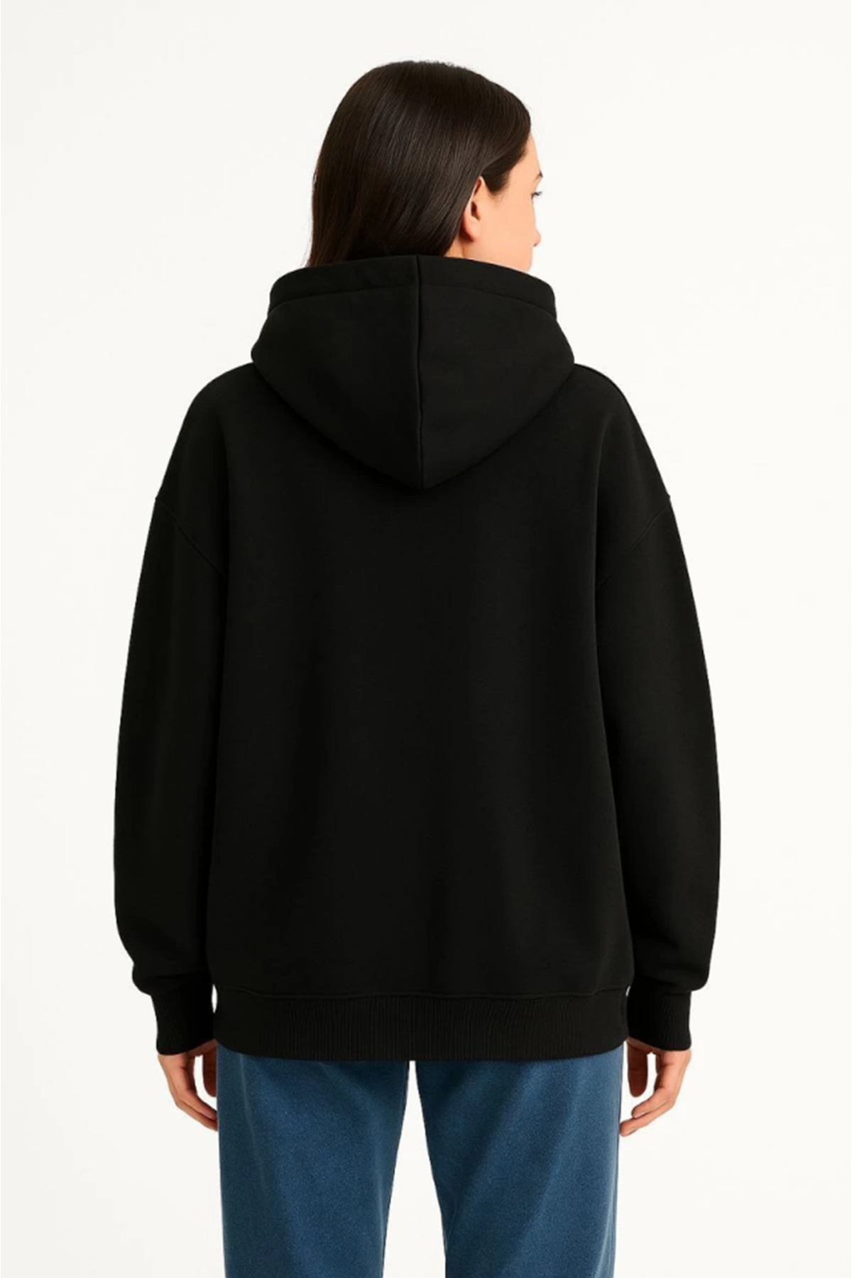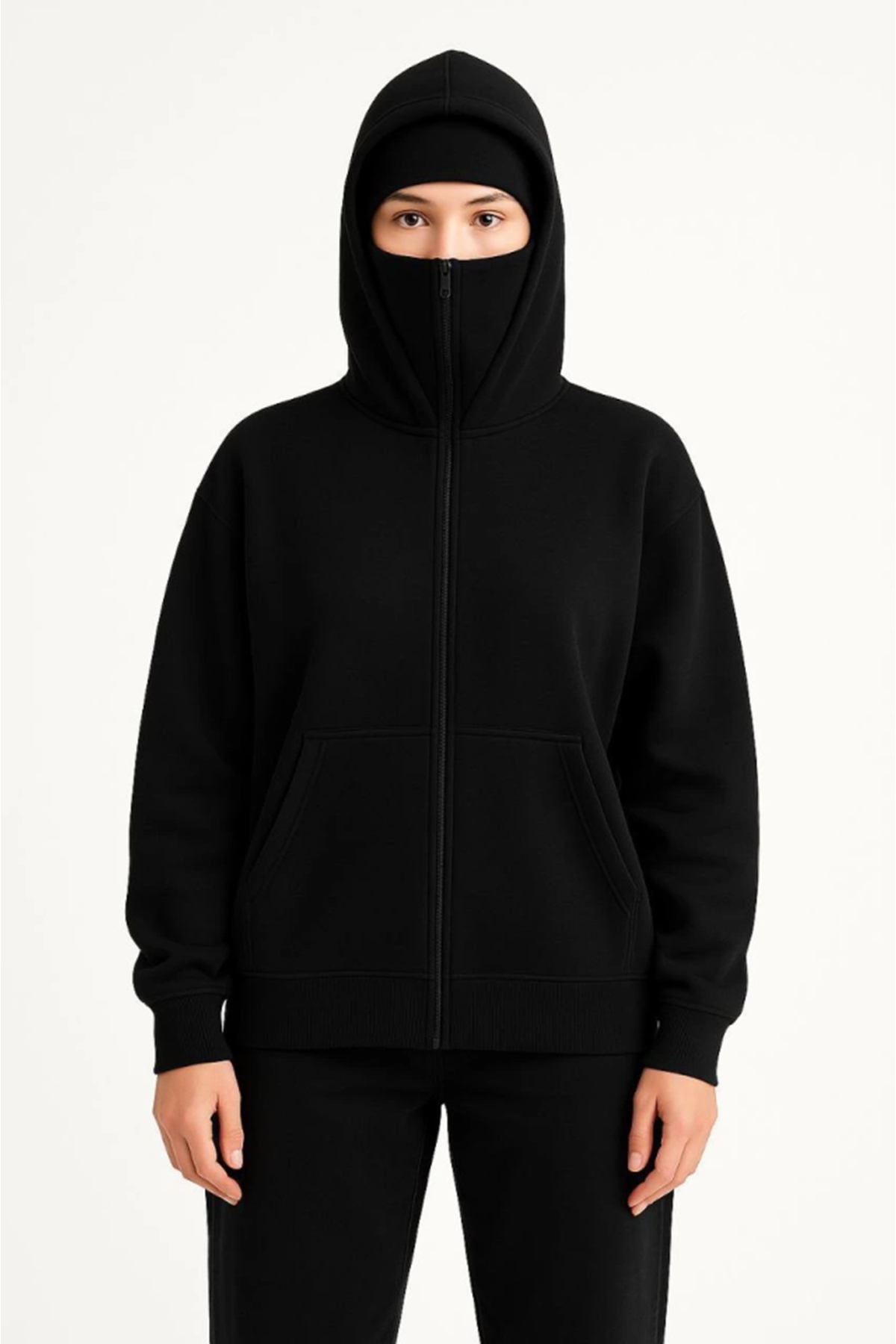 Samuray Ninja Çift Kapşonlu ZIP Fermuarlı Kanguru Çepli Hoodie Maske Detaylı Swetshirt - Siyah