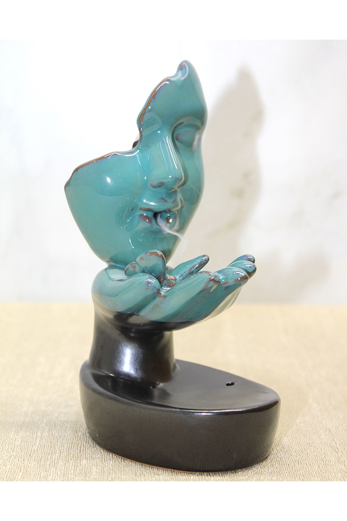 SERAMİK MASK TASARIMLI GERİ AKIŞ TÜTSÜLÜK Ürün Özellikleri Seramik Mask Tasarımlı Geri Akış Tütsülük, mistik mask formu ve modern hatlarıyla hem dekoratif hem de aromaterapi amaçlı kullanılabilen etkileyici bir tasarımdır. 10x7 cm boyutundaki kompakt yapısı sayesinde çalışma masasında, meditasyon köşelerinde, oturma odalarında veya hediye amaçlı kullanımda ideal bir tercih sunar. Seramik malzeme kullanılarak üretilen bu tütsülük, yüksek ısıya dayanıklı yapısıyla geri akış konik tütsülerin güvenli bir şekilde kullanılmasını sağlar. Geri akış özelliği sayesinde tütsü dumanı maskenin içinden aşağı doğru süzülerek görsel olarak sakinleştirici ve estetik bir şelale etkisi oluşturur. Ortama dinginlik katan duman akışı, hem ruhsal rahatlama hem de dekoratif zenginlik sunar. Paket İçeriği 1 adet Seramik Mask Tasarımlı Geri Akış Tütsülük