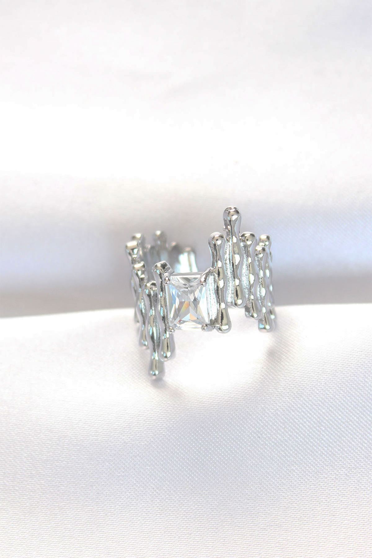Silver Renk Tırtıklı Kalın Baget Taş Tasarım Ayarlanabilir Yüzük - TJ-BYK3104