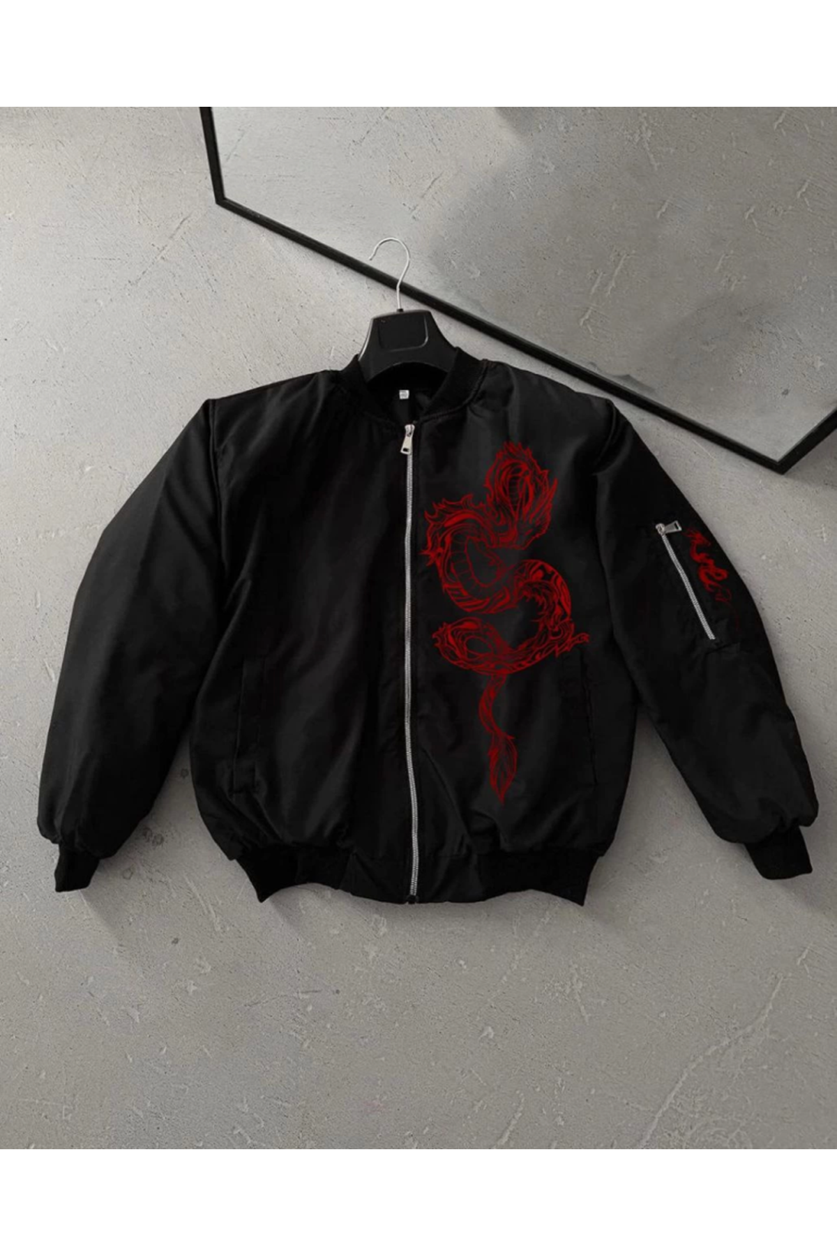 Tam Kalıp Uzun Kol Baskılı Bomber Ceket - Siyah