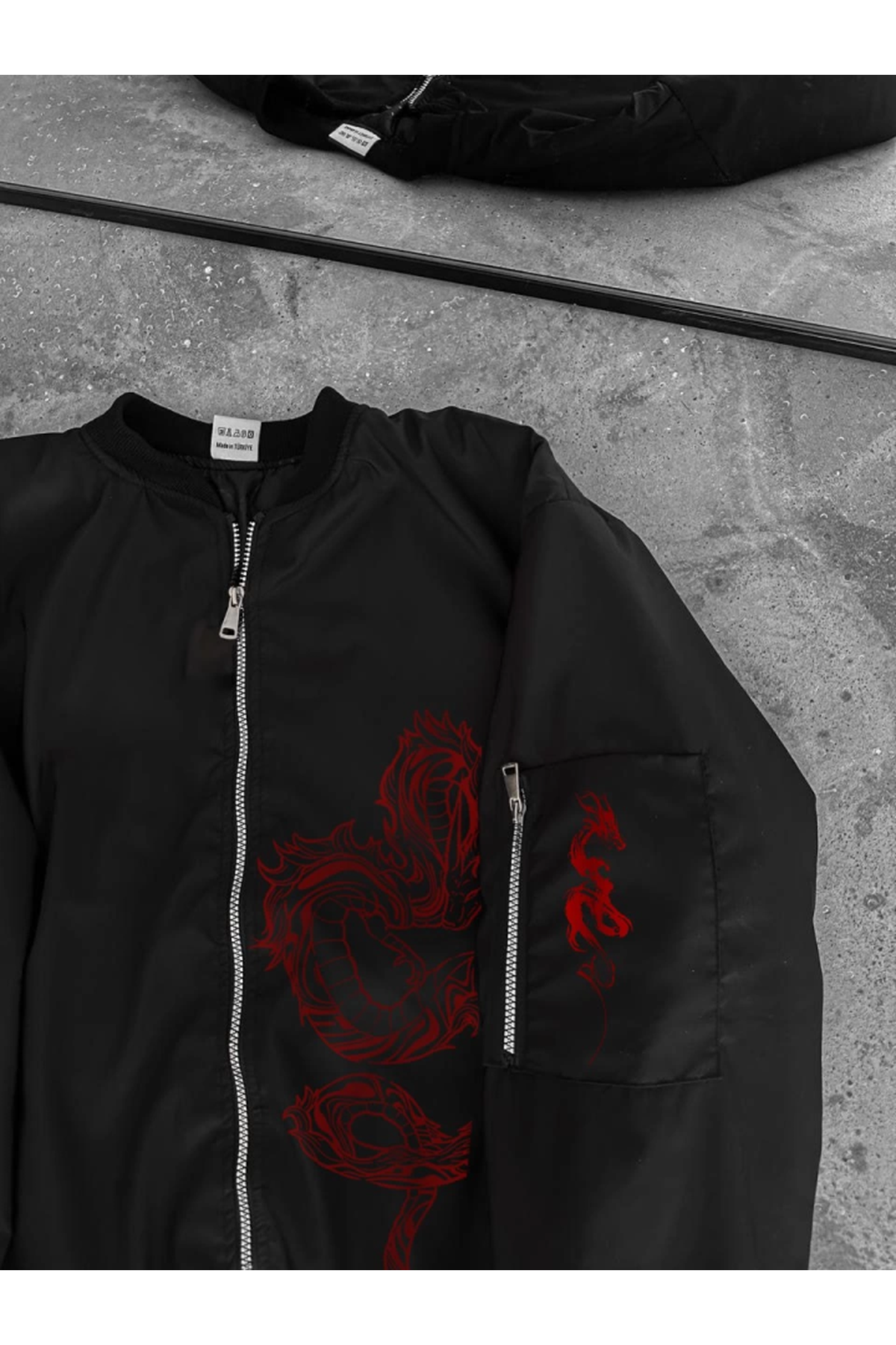 Tam Fermuarlı Uzun Kol Baskılı Bomber Ceket - Siyah