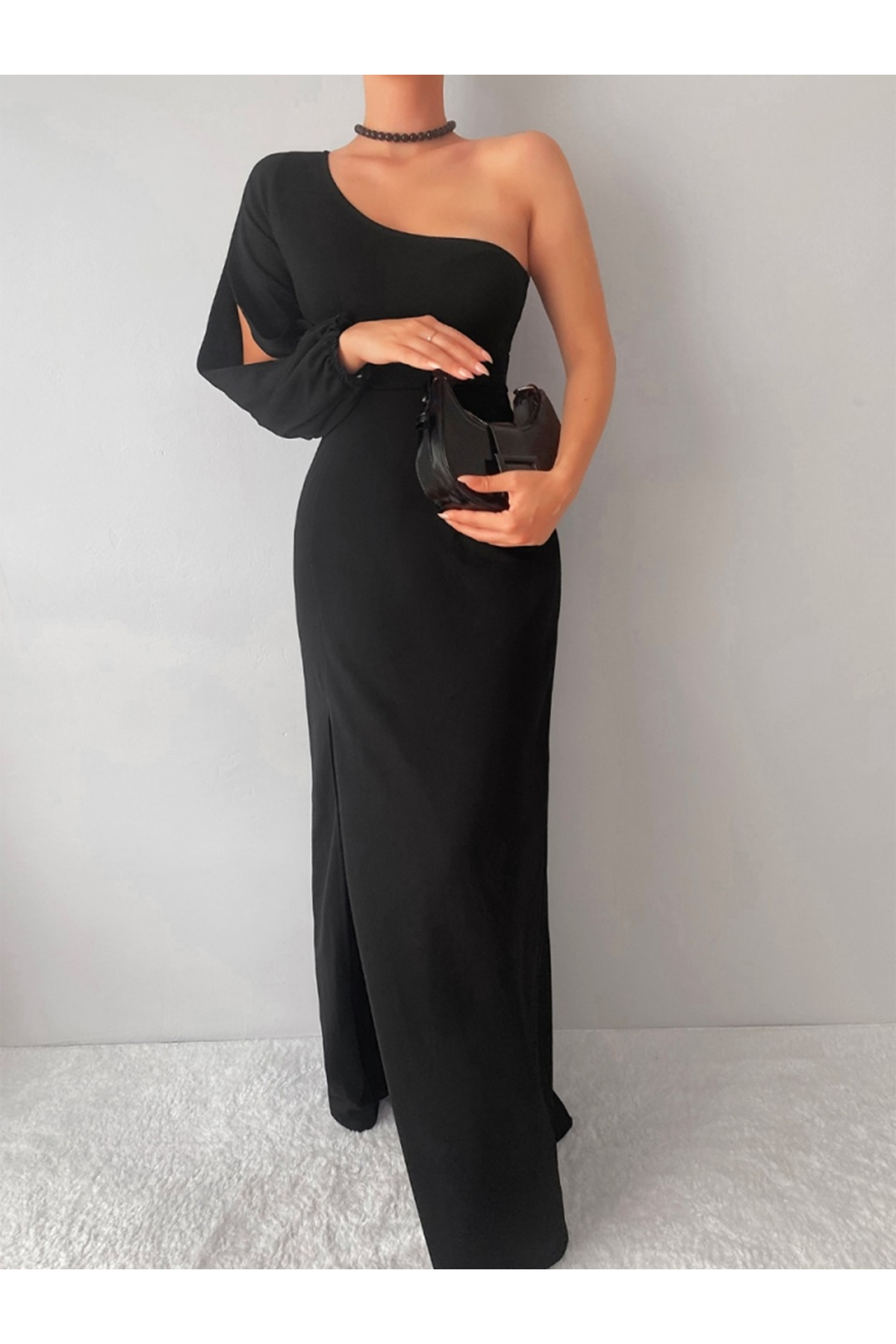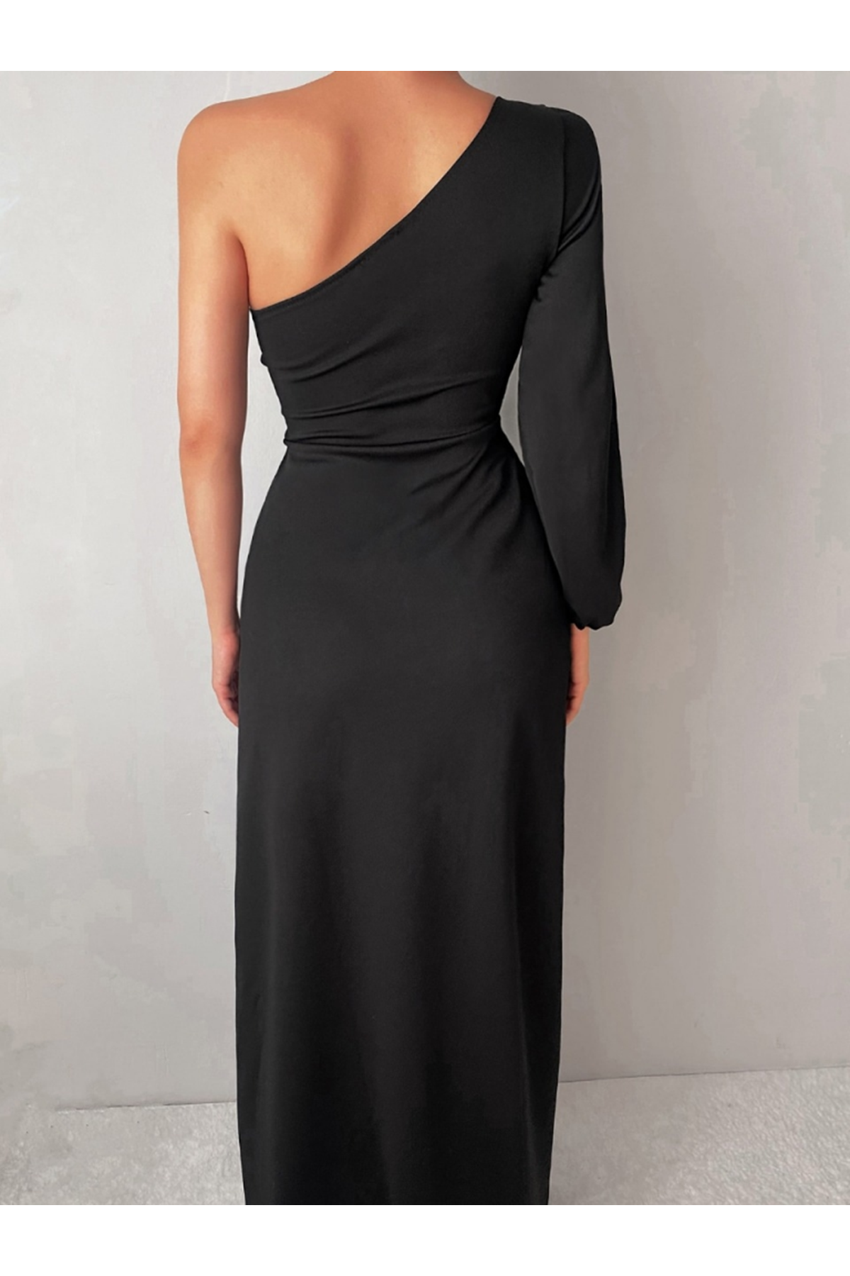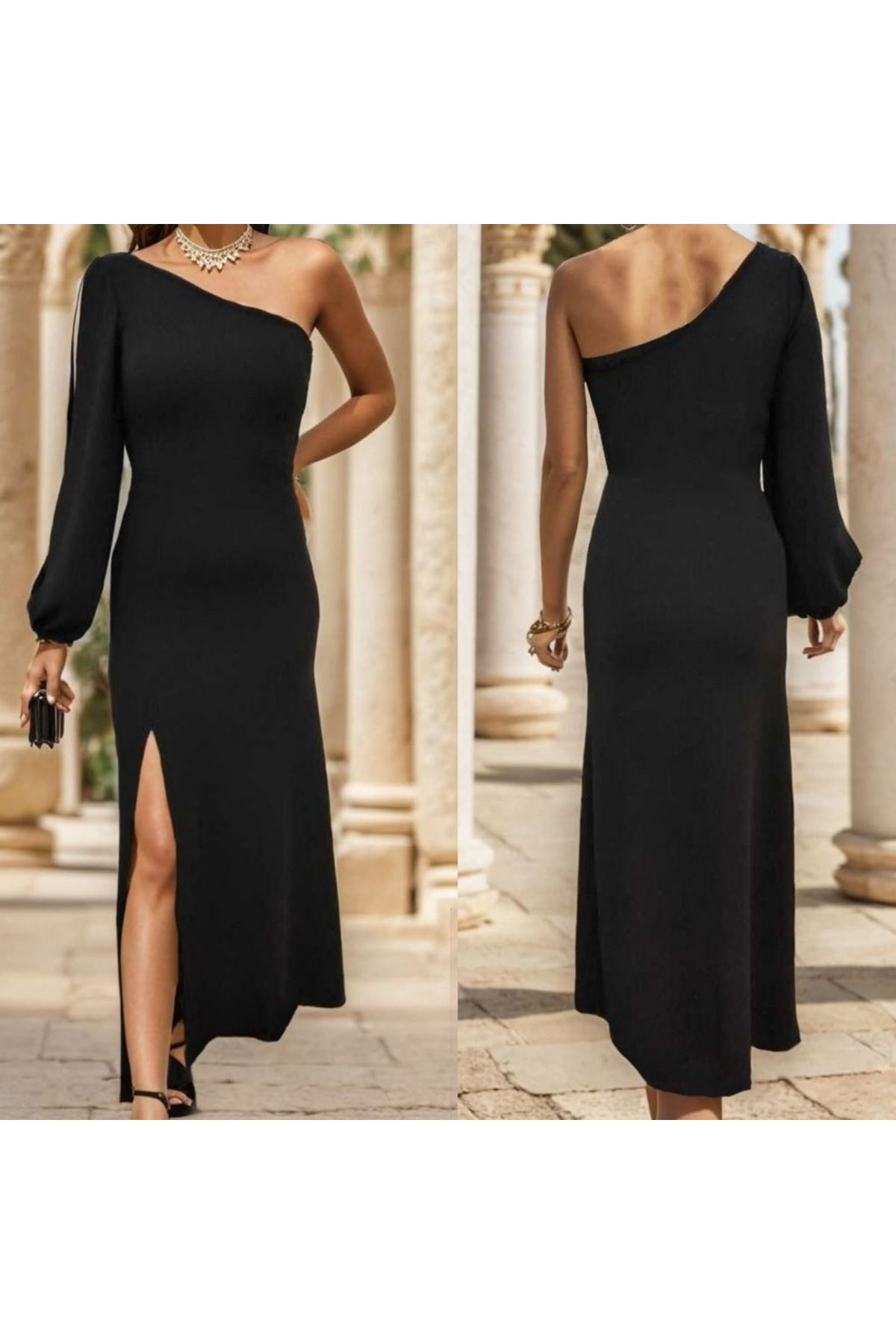 Tek Omuz Açık Derin Yırtmaçlı Krep Tam Boy Elbise