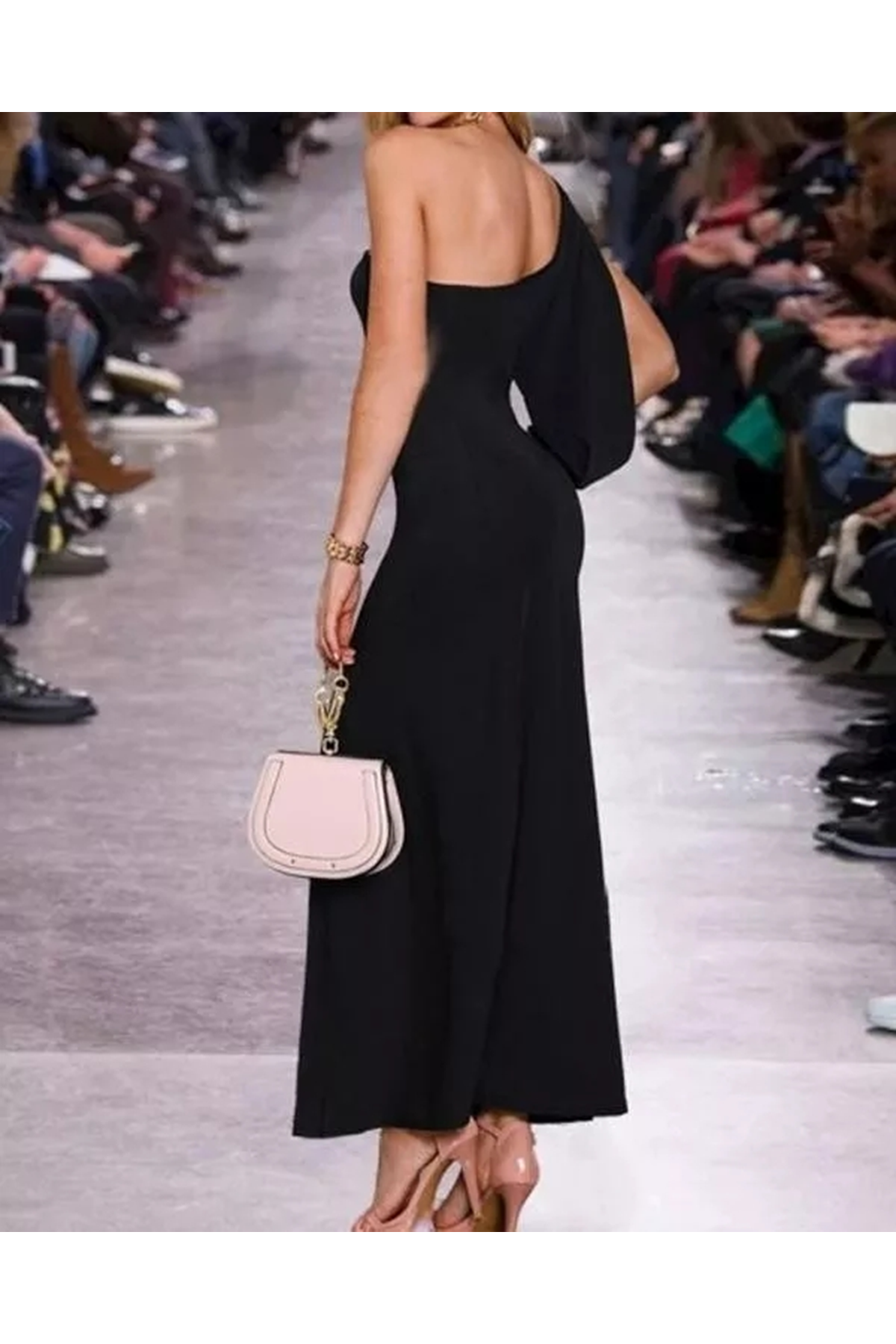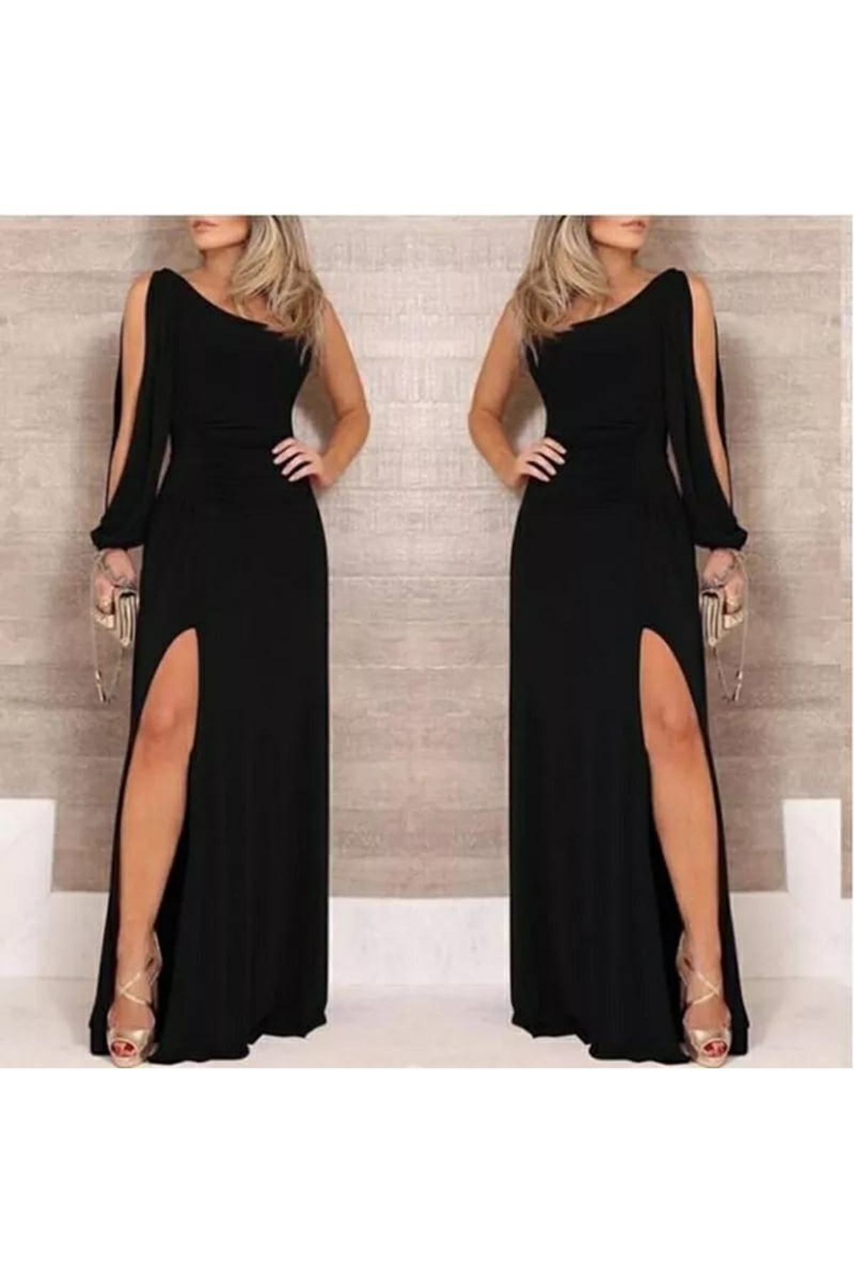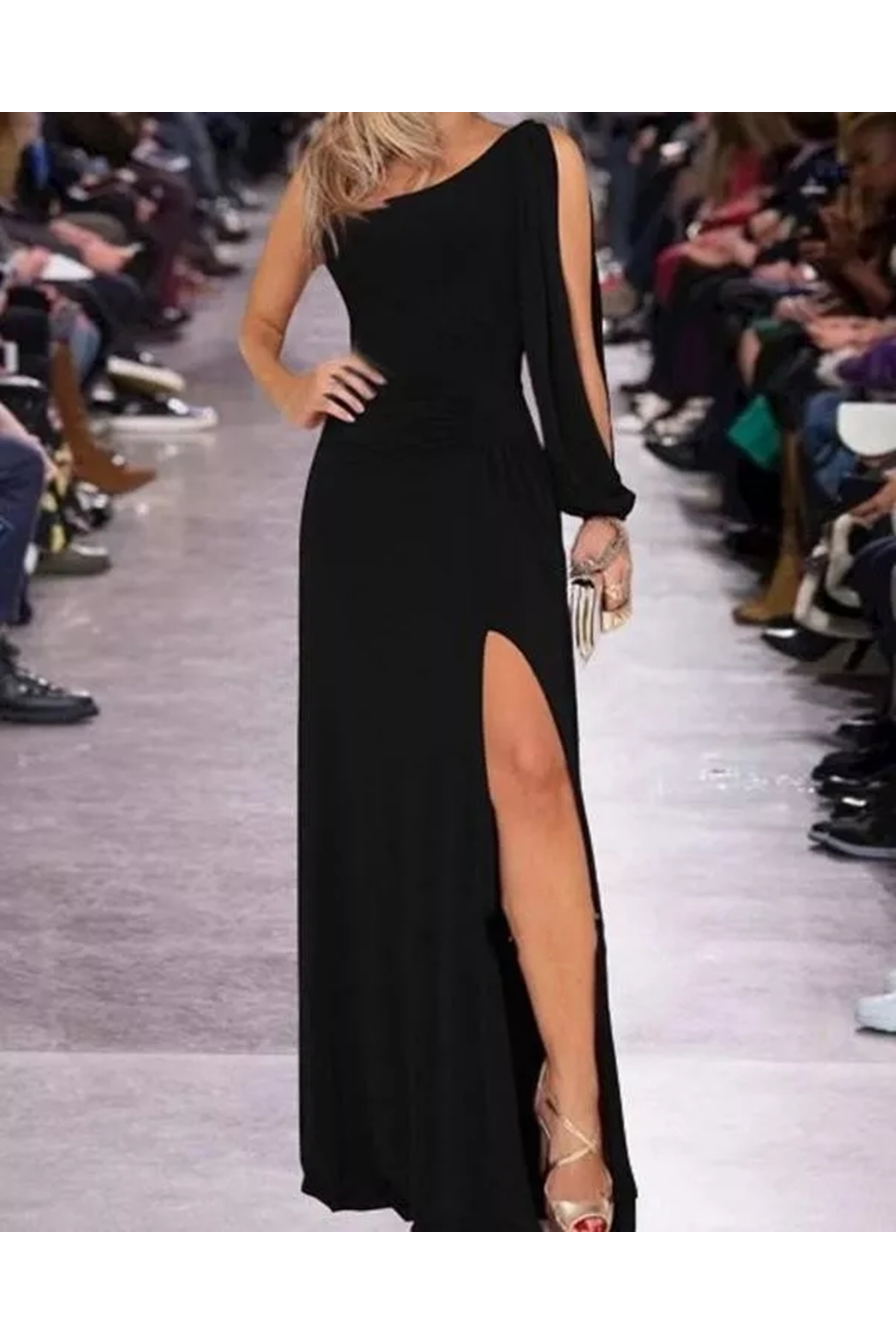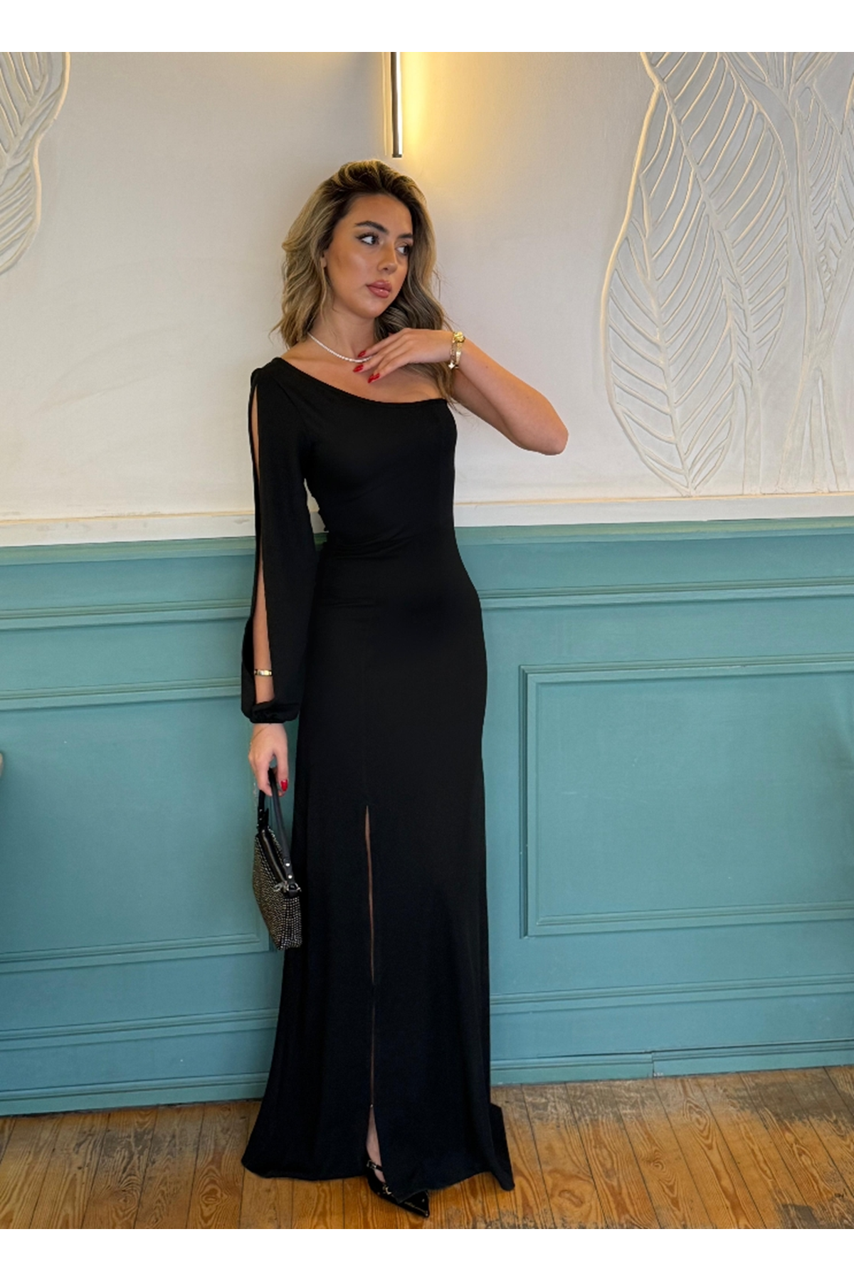Tek Omuz Açık Derin Yırtmaçlı Krep Tam Boy Elbise