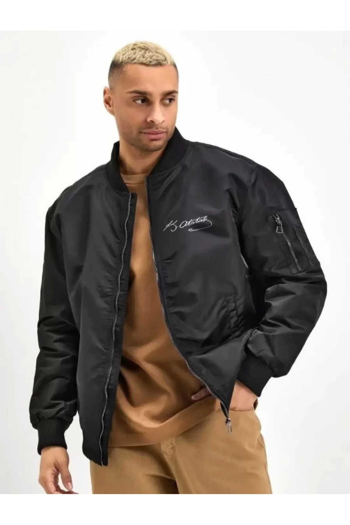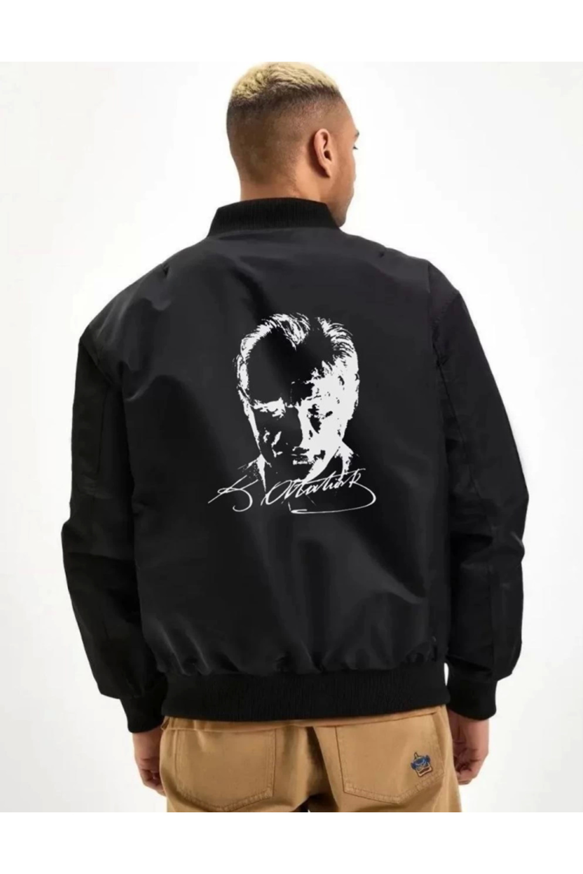 Unisex Uzun Kol Baskılı Bomber Ceket - Siyah