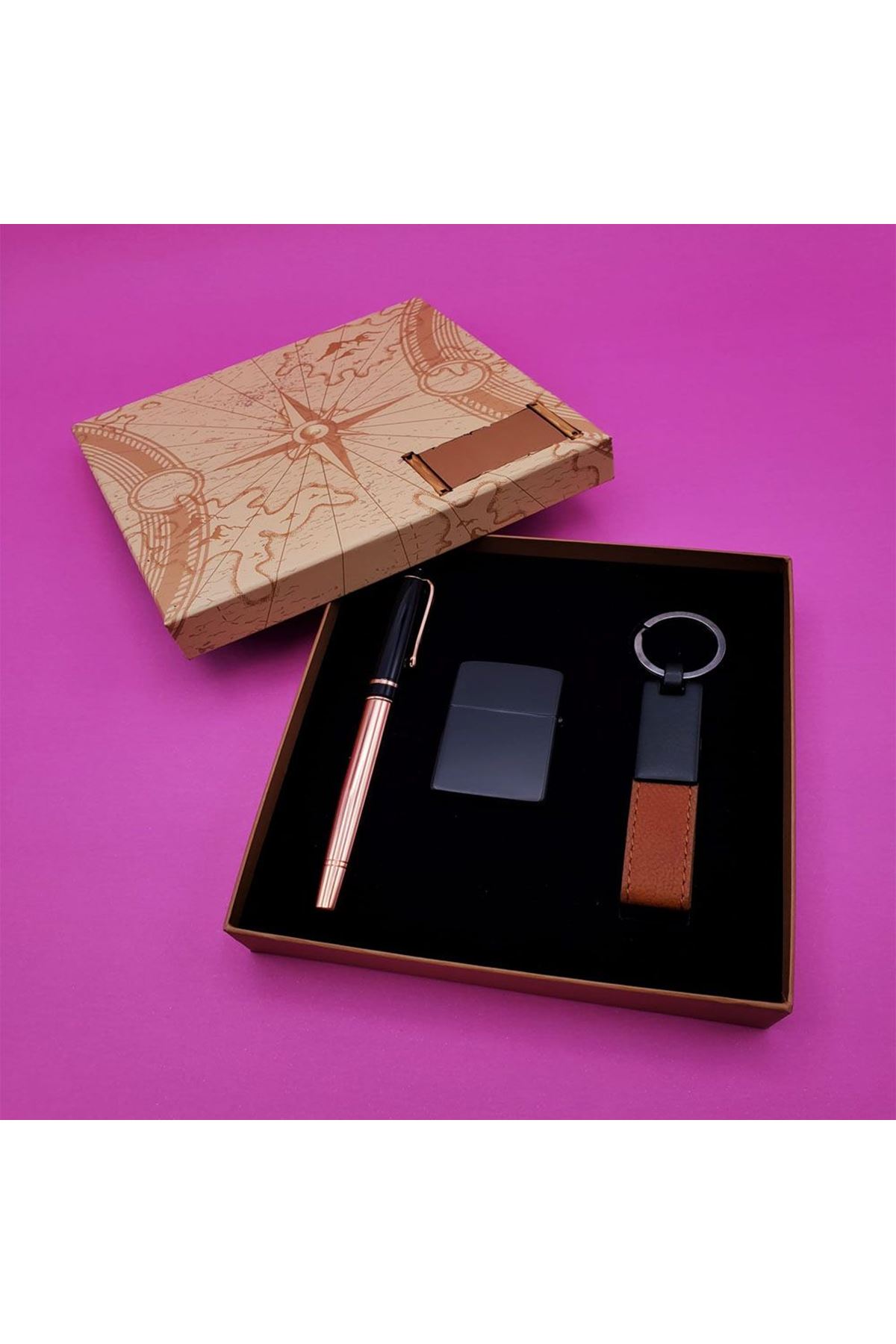 * Kutu Kaliteli Mukavva Malzemeden Üretilmiştir. * Anahtarlık Kaliteli Deri Ve Metal Malzemeden Üretilmiştir.* Çakmak Kaliteli Metal Malzemeden Üretilmiştir.* Siyah Mat Çakmak Zippo Çakmaktır.(Benzinsiz Gönderilmektedir.)* Kalem Metal Malzemeden Üretilmiştir Olup Rollerdir.
