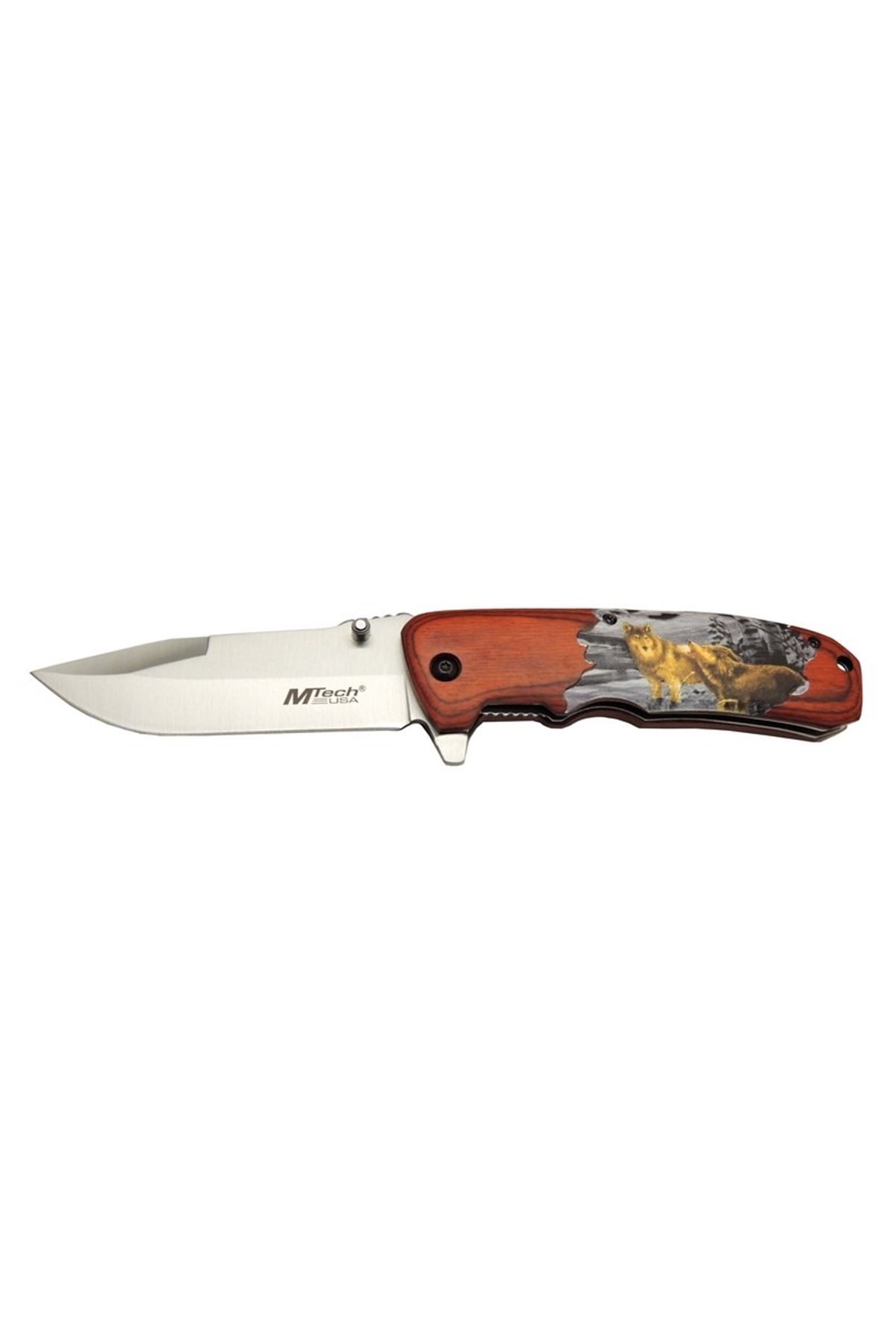 Y 12K Kahverengi Kamp Çakı 21,5cm - Yarı Otomatik, Kurt Baskılı Ahşap Sap
