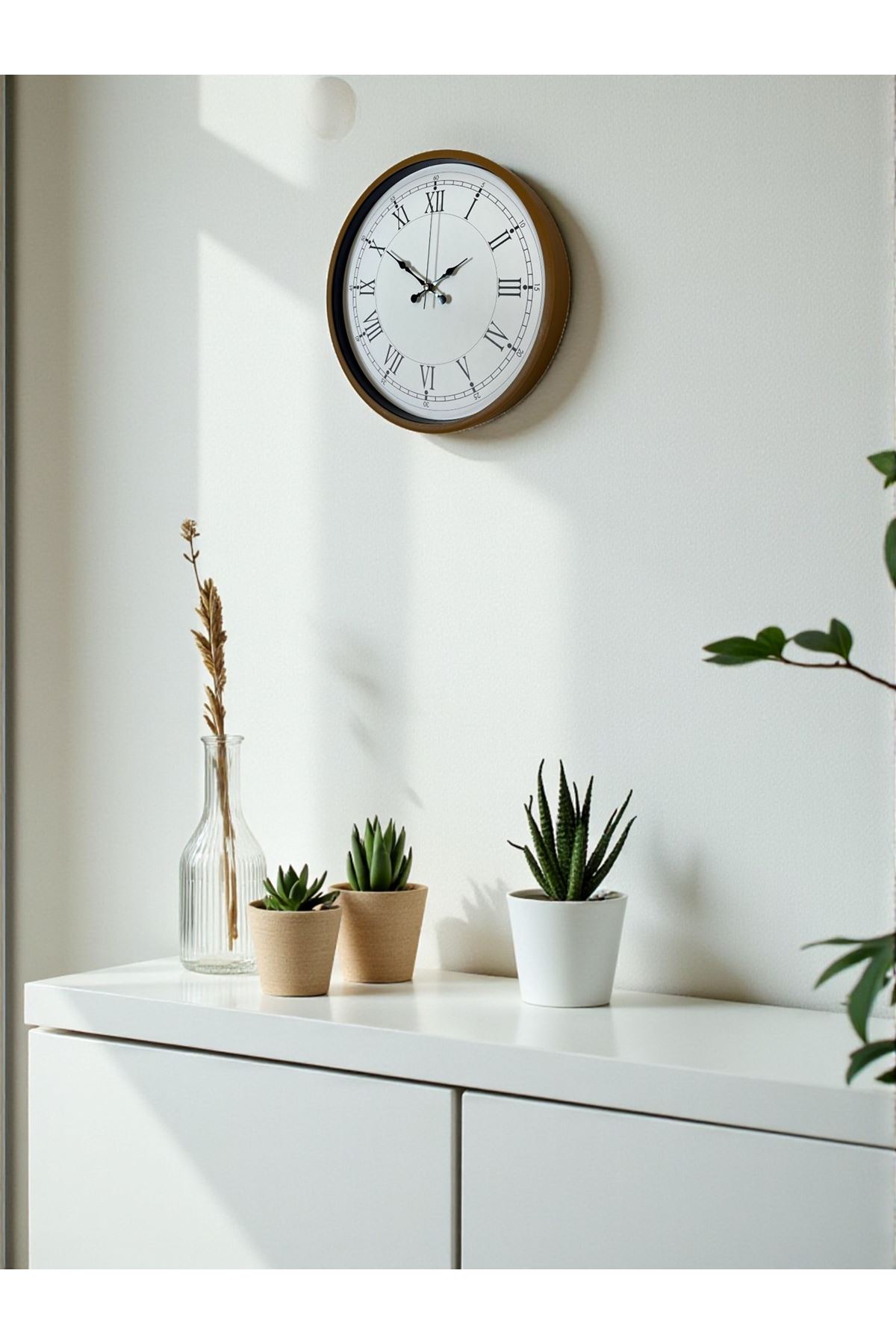 Beyaz zemin üzerine yerleştirilmiş siyah Roma rakamları, klasik saat görünümünü desteklerken aynı zamanda yüksek okunabilirlik sağlar. Akrep ve yelkovanın zarif tasarımı, çift halka detaylarıyla birleşerek saatin genel estetik bütünlüğünü güçlendirir. Saatin mekanizması sessiz akan saniye (akar saniye) teknolojisiyle çalışır; bu da saat çalışırken hiçbir tıkırtı sesi oluşmadığı anlamına gelir. Bu özellik, özellikle yatak odası, çalışma odası ve ofis gibi sessizliğin önemli olduğu alanlarda büyük avantaj sağlar.