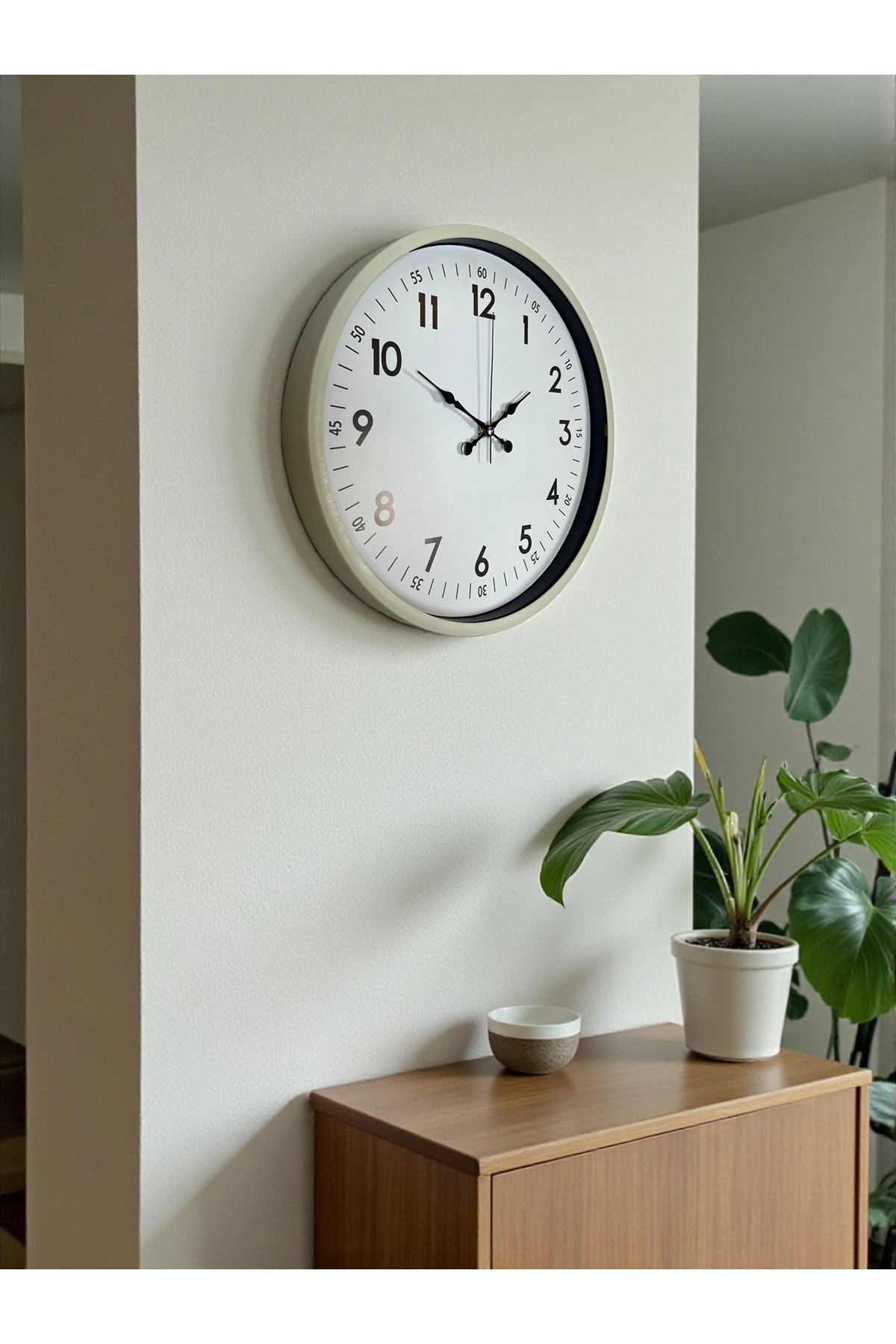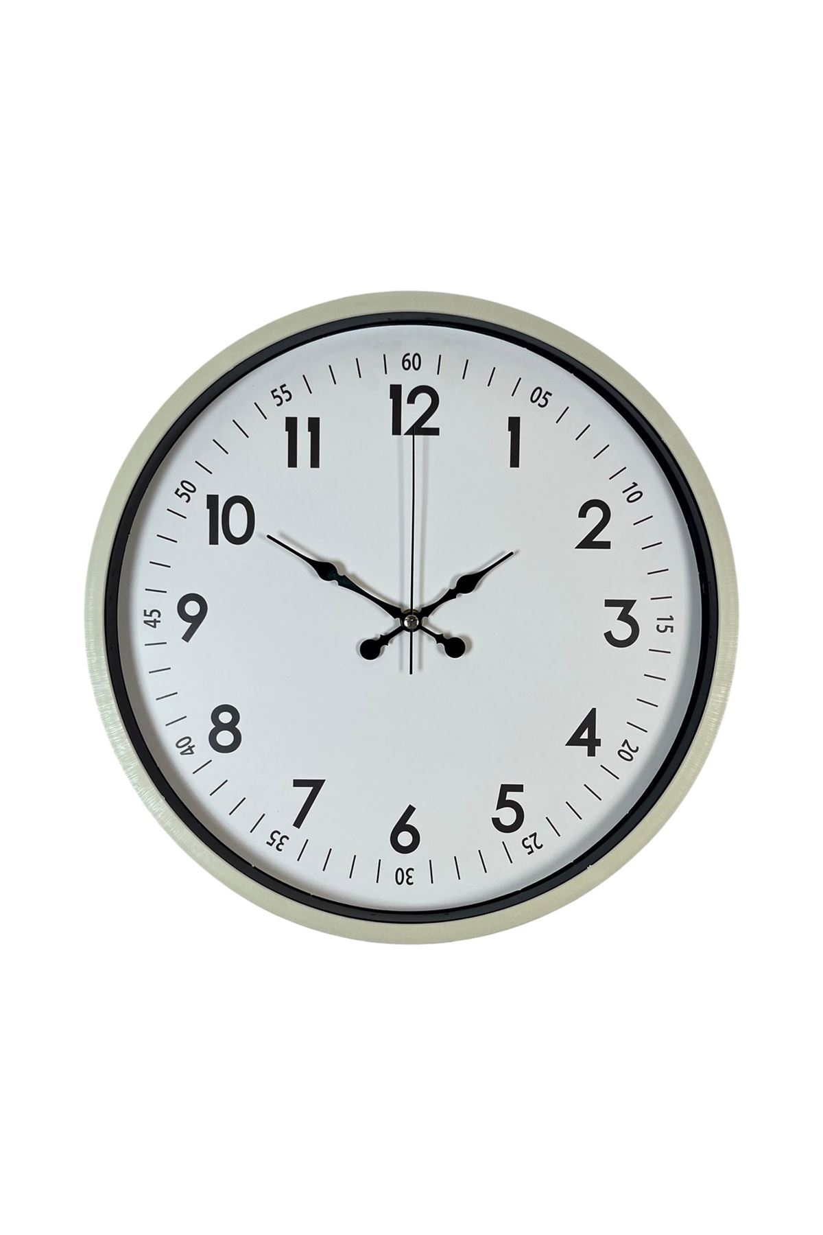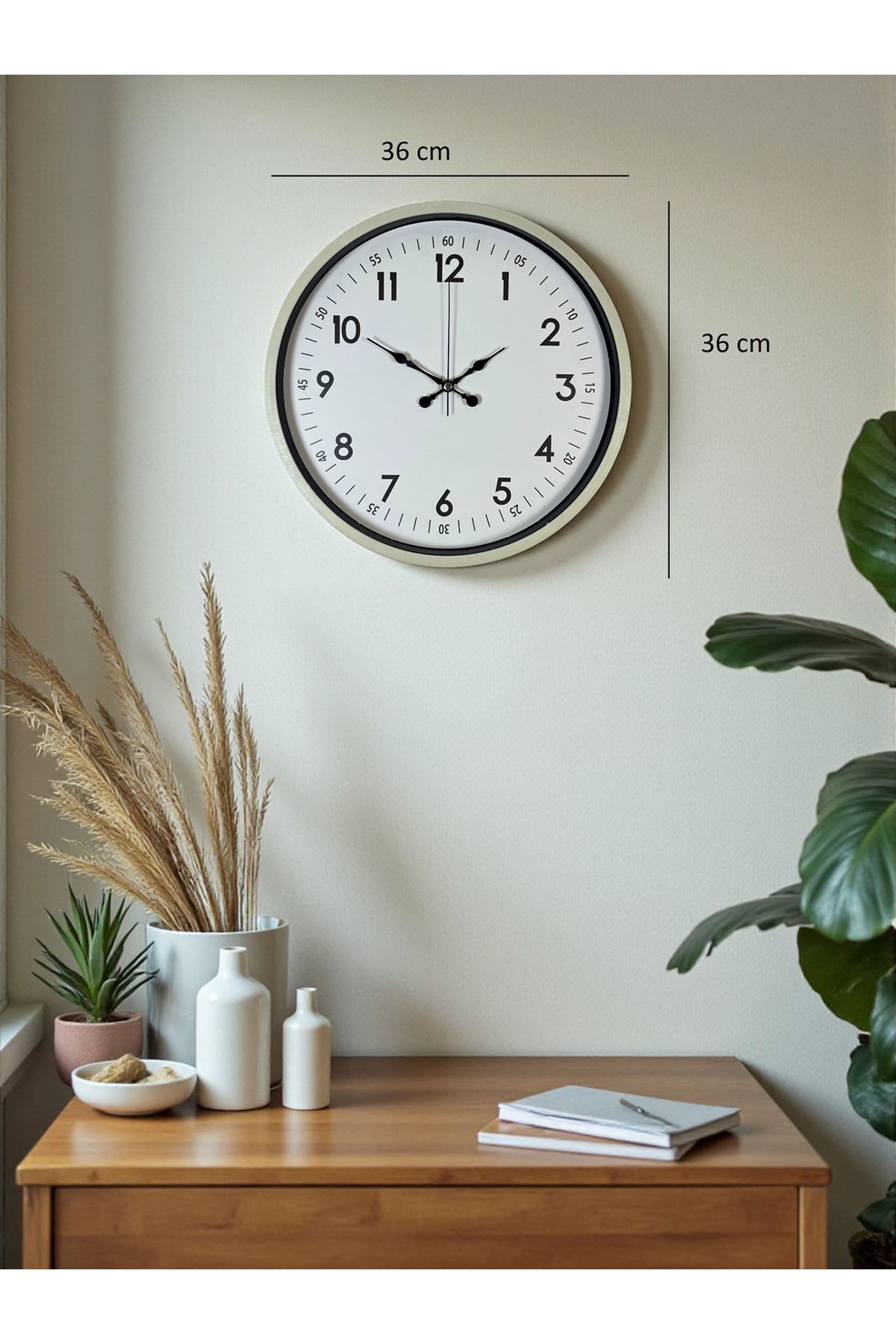 Doğal tonları modern tasarımla birleştiren bu 36 cm krem duvar saati, yaşam alanlarına sıcak, sade ve zarif bir dokunuş katmak isteyenler için ideal bir tercihtir. Krem çerçevesi, ortama yumuşak ve şık bir hava kazandırırken; geniş beyaz kadranı, belirgin siyah rakamları ve ayrıntılı dakika göstergeleri (05, 10, 15...) ile yüksek okunabilirlik sunar. Hem dekoratif hem de fonksiyonel bir saat arayanlar için mükemmel bir çözümdür.