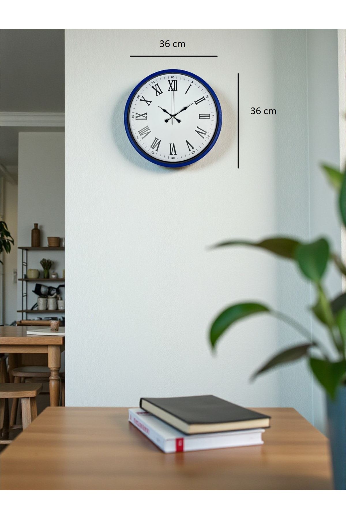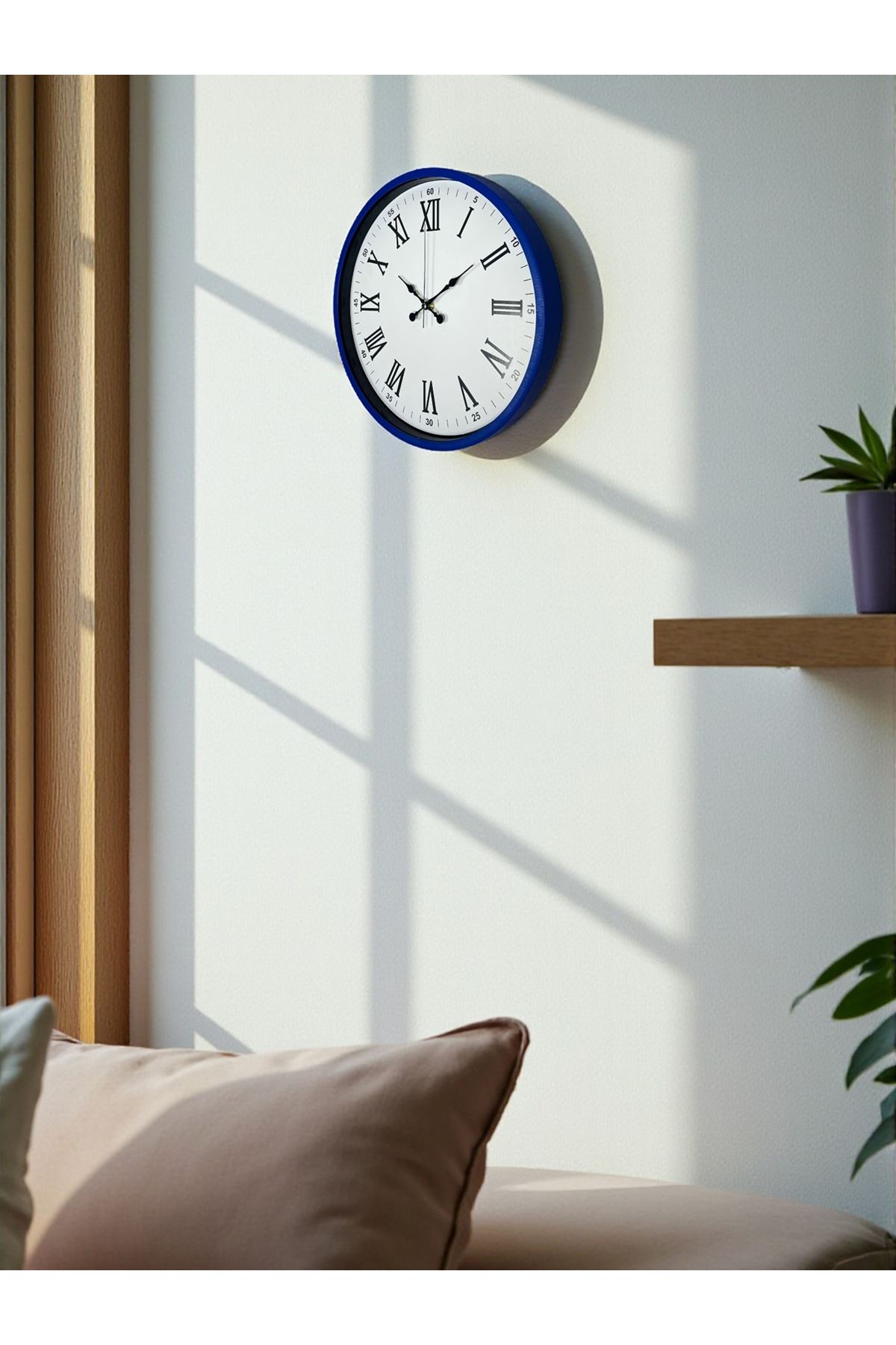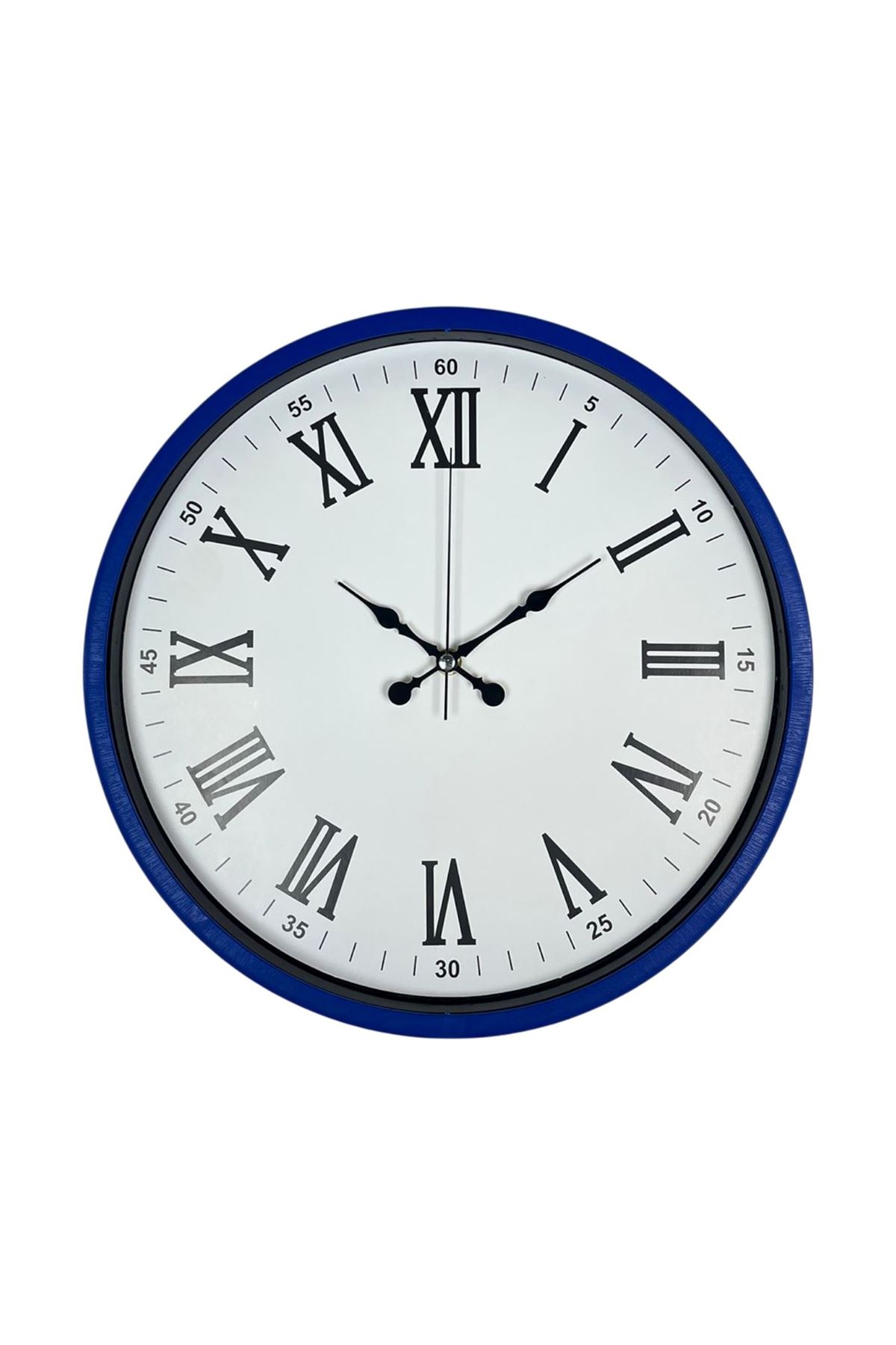Klasik Roma rakamlarının zarafetini modern bir çerçeveyle buluşturan 36 cm lacivert duvar saati, ev ve iş yerlerinde dekoratif şıklık arayanlar için mükemmel bir seçimdir. Derin lacivert çerçevesi, beyaz kadranı ve büyük Roma rakamlarıyla hem modern hem klasik tarzın birleştiği zamansız bir tasarım sunar.