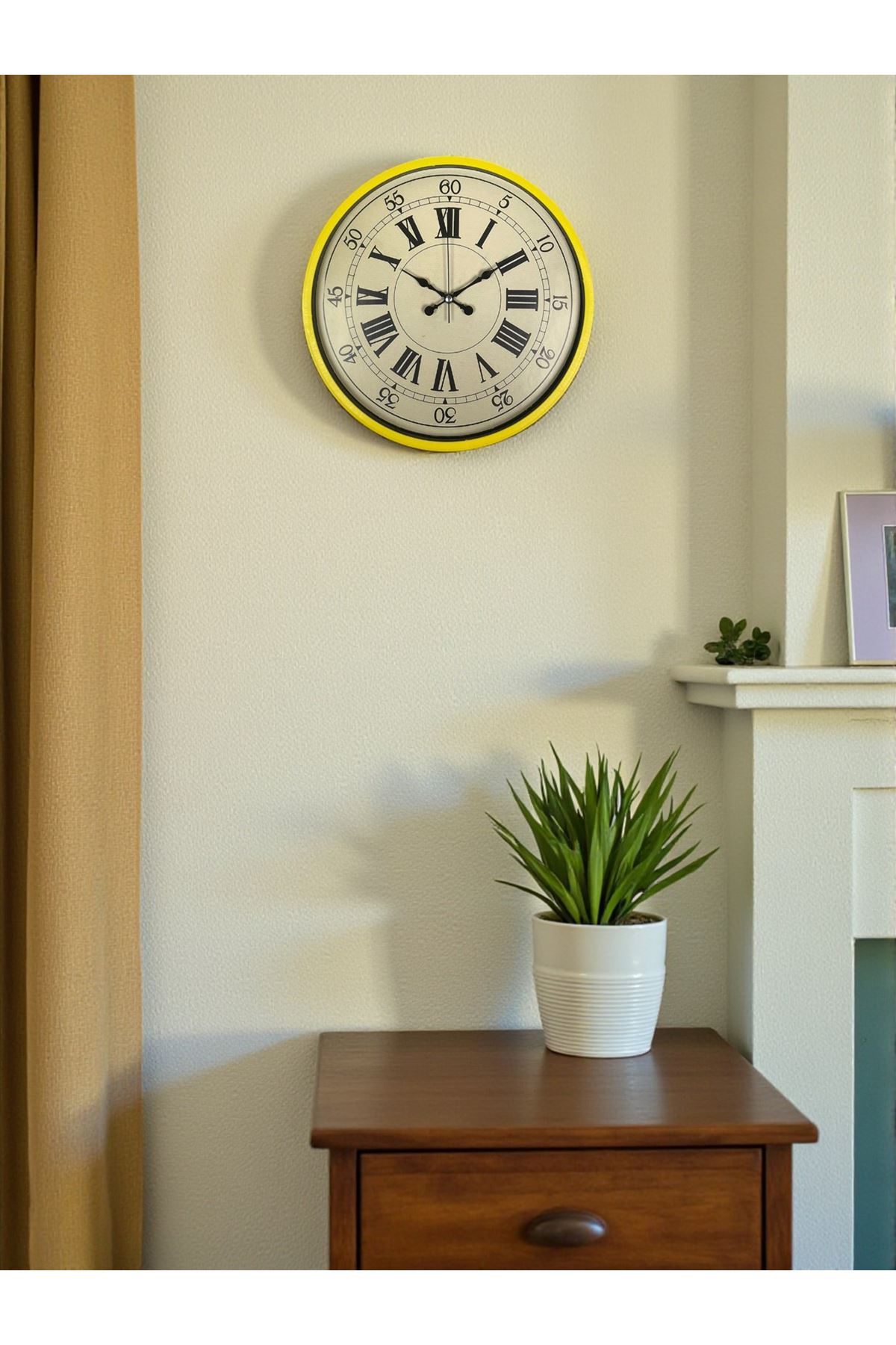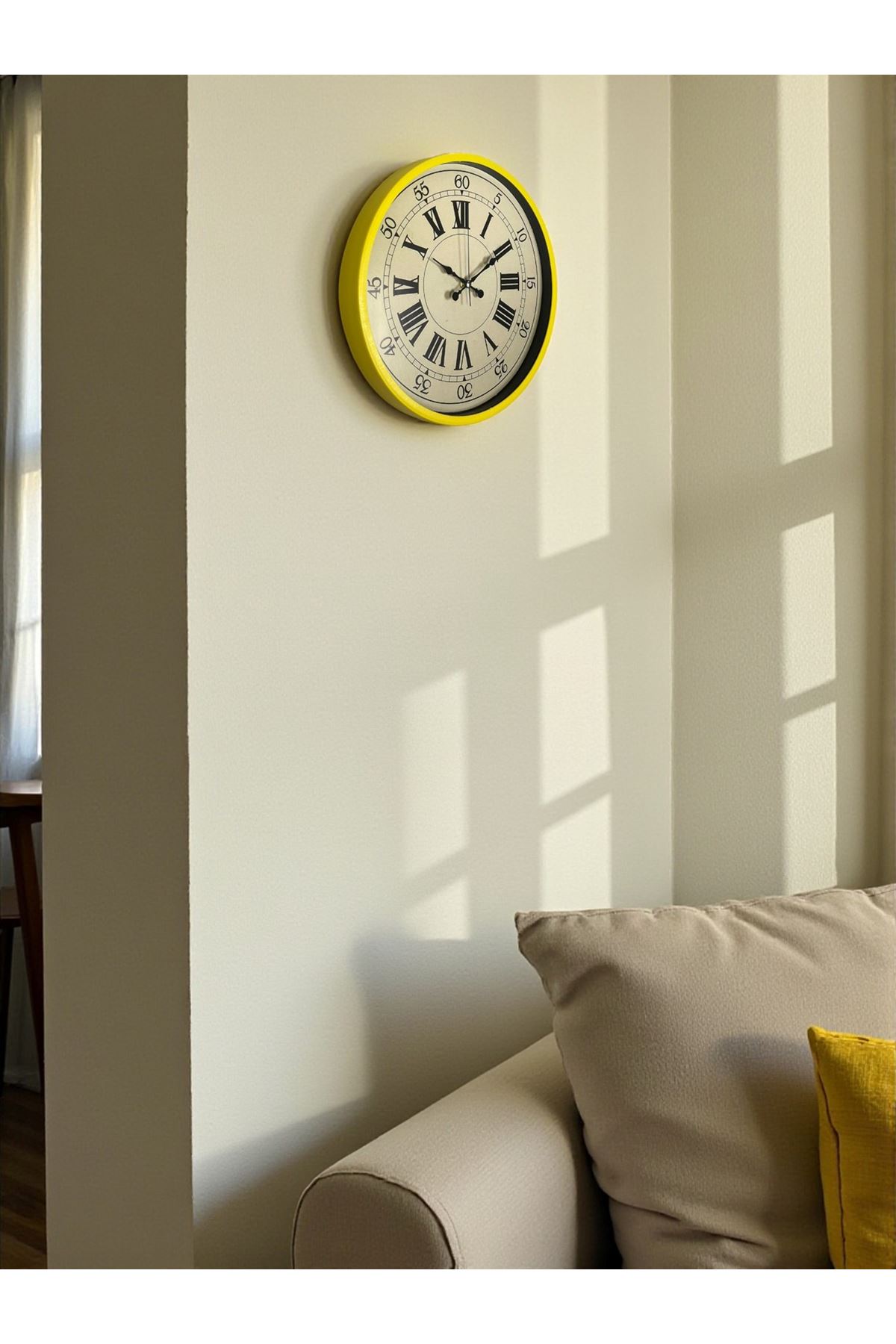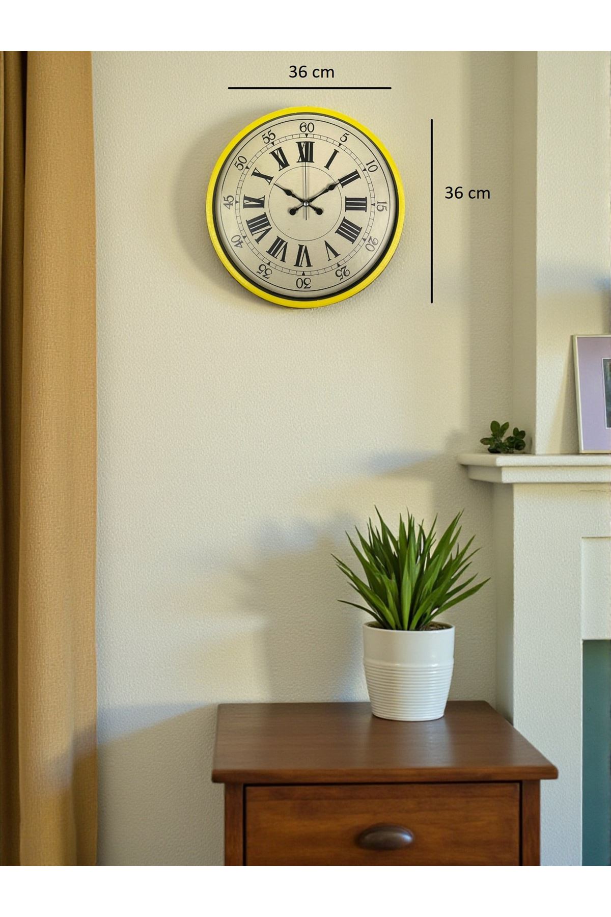 36 cm ideal büyüklüğü ile duvarlarda kendini gösteren ama rahatsız etmeyen dengeli bir görüntü sunar. Sarının enerjisi, eskitme kadranın sıcaklığı ile birleşerek mekânlara hem canlılık hem de zarafet katar.