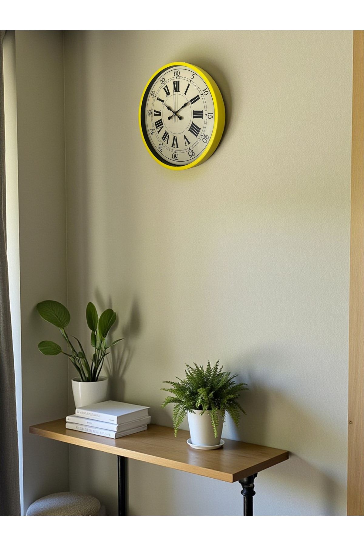 Canlı sarı çerçevesi ve eskitme krem tonlarındaki şık kadranı ile fark yaratan 36 cm Sarı Duvar Saati, bulunduğu ortama enerjik, modern ve estetik bir hava katar. Tasarımında kullanılan büyük ve okunaklı siyah Roman rakamları, retro ve vintage tarzı benzersiz bir şekilde modern dokunuşlarla birleştirir. Ev dekorasyonunda güçlü bir detay arayanlar için ideal bir seçimdir.