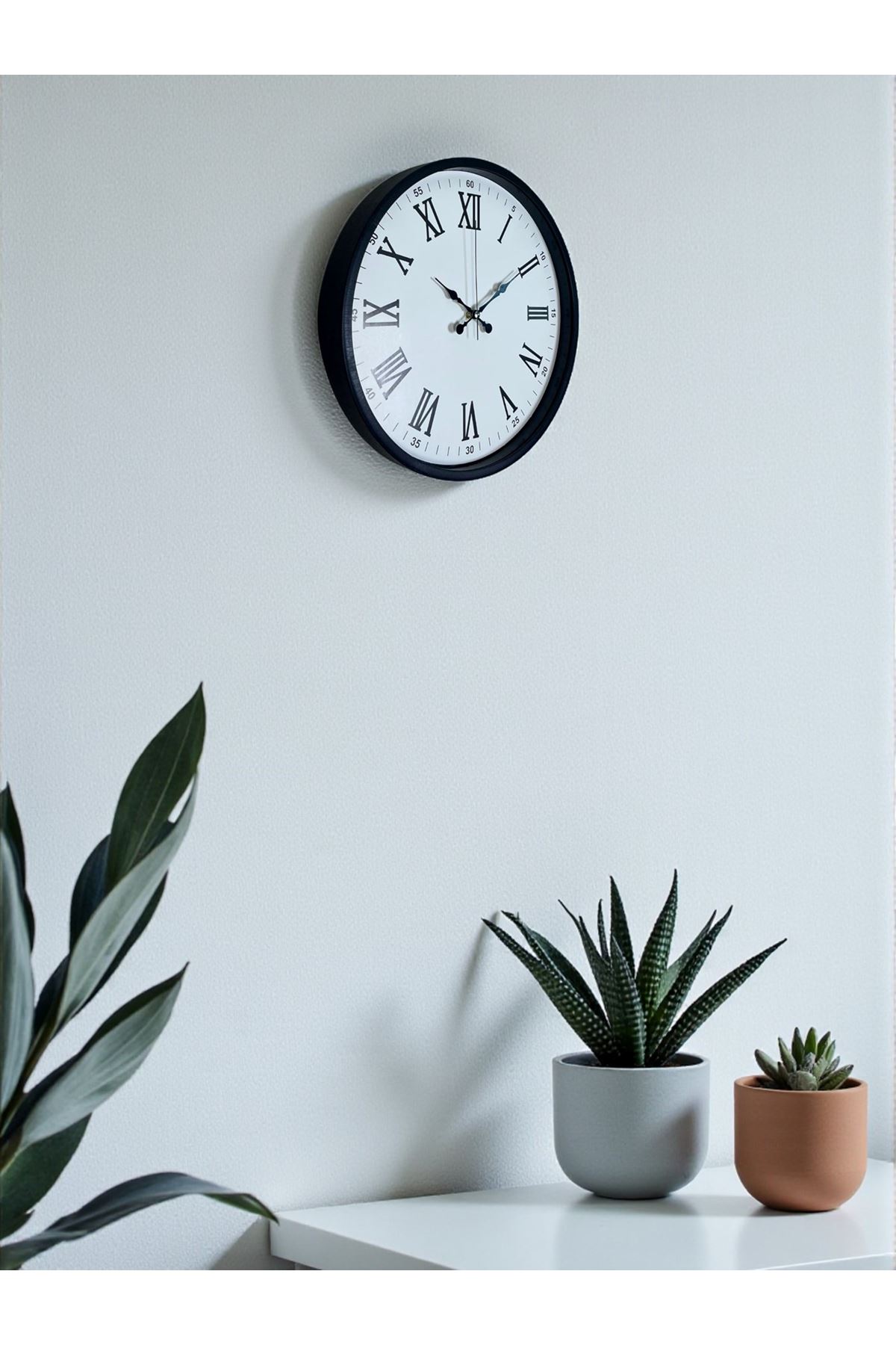 Siyah çerçeve rengi, beyaz zemin üzerine işlenmiş büyük ve okunabilir Roma rakamlarıyla güçlü bir kontrast oluşturarak uzak mesafeden bile net bir görüş sağlar. Sessiz akan saniye mekanizması, ses çıkarmadan çalışarak özellikle çalışma odası, yatak odası ve ofisler için ideal bir kullanım sunar. Klasik saat estetiğini sevenler için hem dekoratif hem de işlevsel bir üründür.