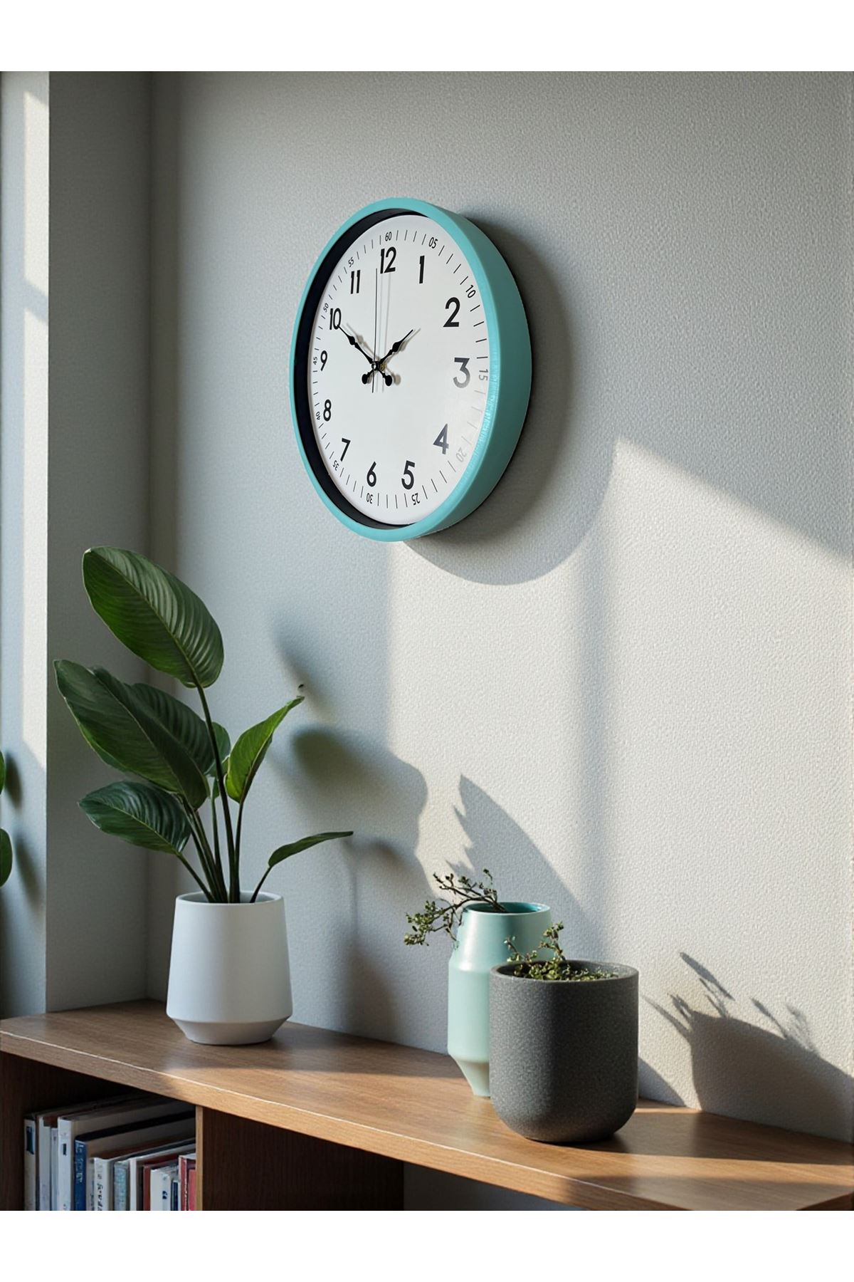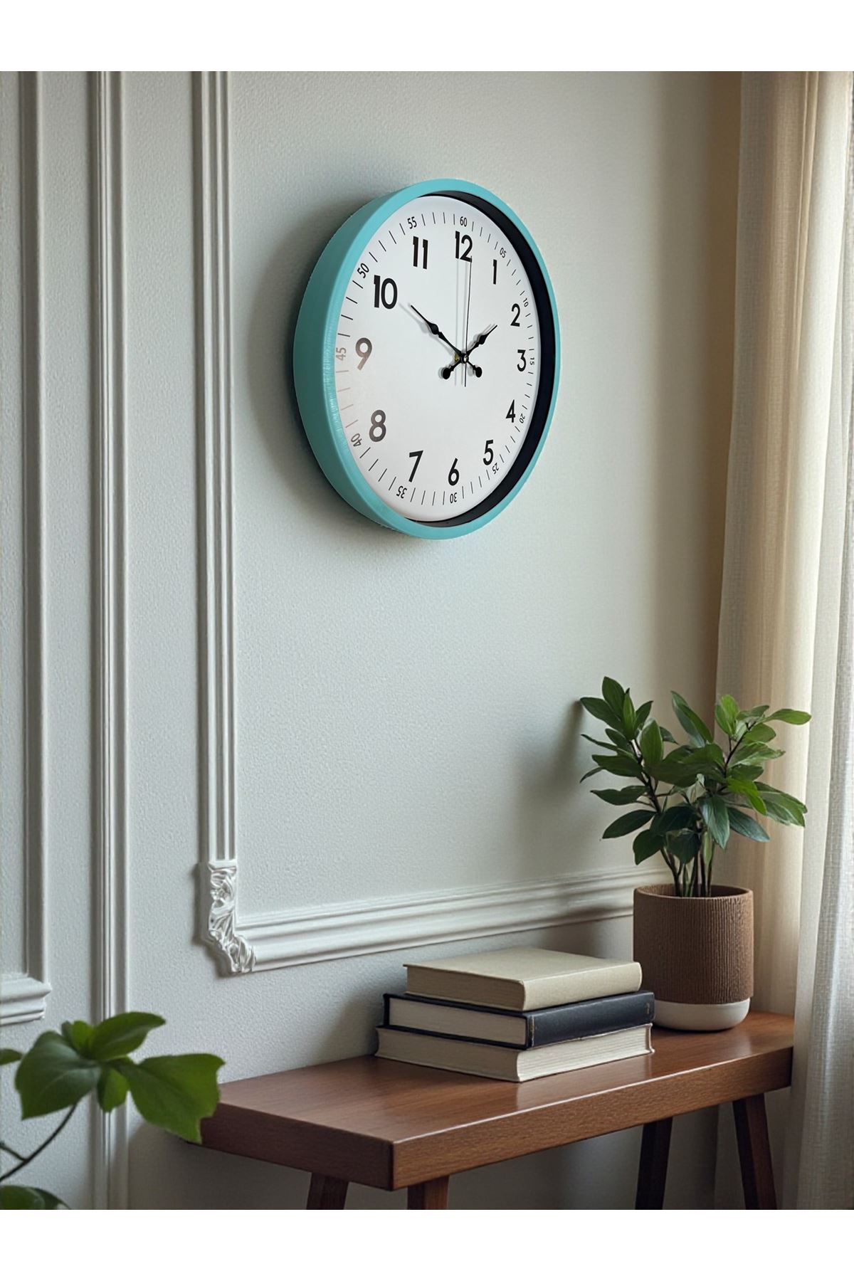 Canlı ve ferah bir renk tonuna sahip olan bu 36 cm turkuaz duvar saati, bulunduğu ortama modern, enerjik ve taze bir hava katmak için tasarlandı. Turkuaz çerçevesi özellikle genç ve dinamik dekorasyonlara mükemmel uyum sağlar; sade beyaz kadranı, büyük okunaklı rakamları ve ayrıntılı dakika göstergeleri (05, 10, 15...) sayesinde zaman takibini çok daha kolay hale getirir. Hem dekoratif hem de fonksiyonel bir saat arayanlar için ideal bir tercihtir.