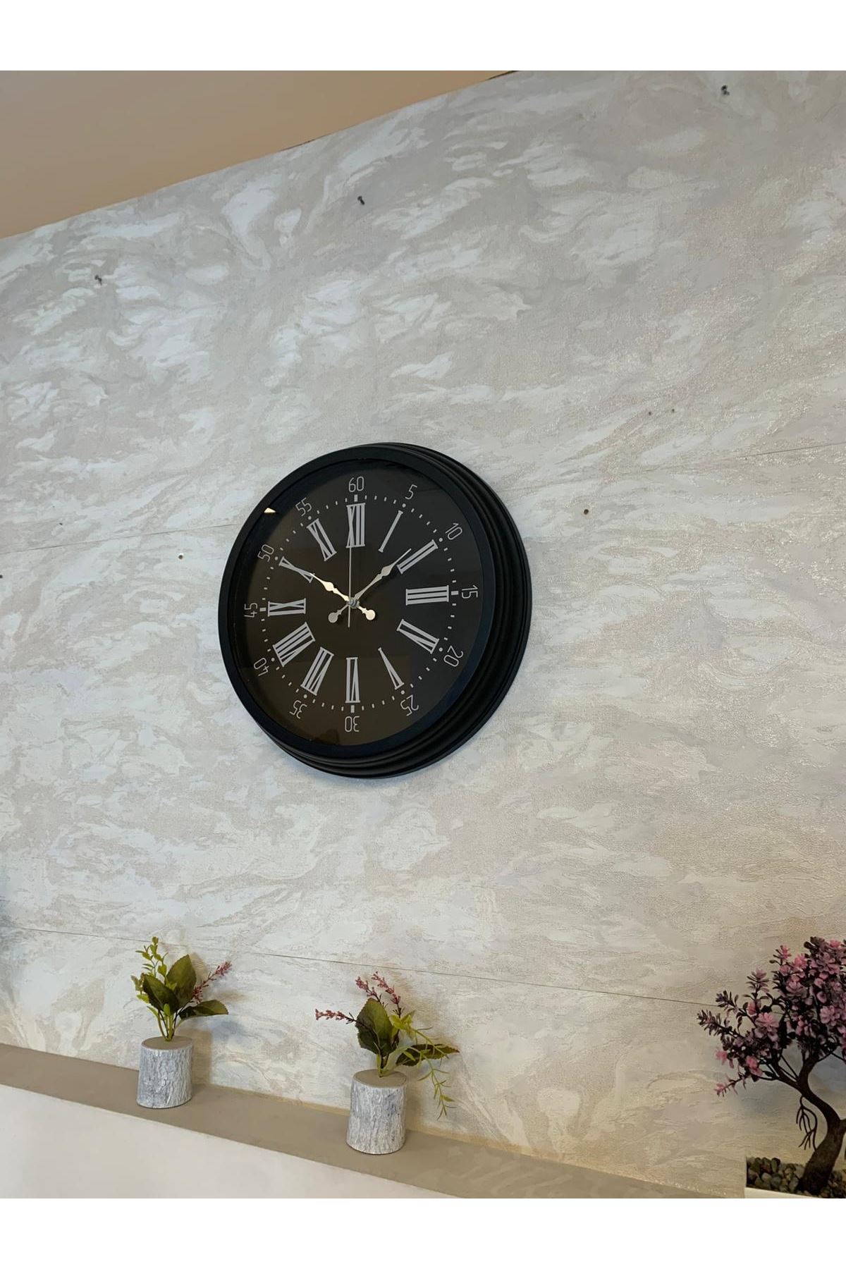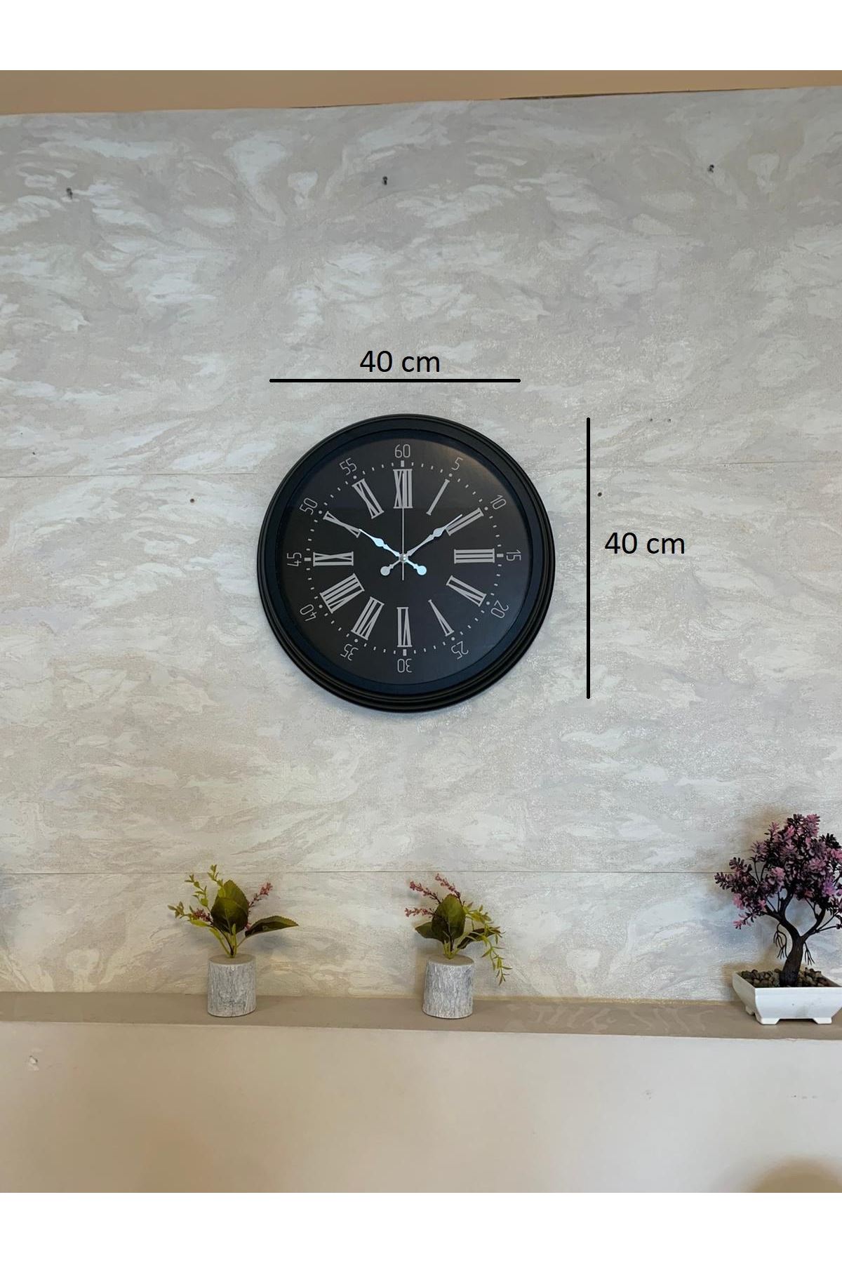 Zarif, güçlü ve klasik çizgileri modern bir görünümle birleştiren 40 cm Siyah Duvar Saati, ev ve iş yerlerine sofistike bir atmosfer katmak isteyenler için mükemmel bir dekorasyon parçasıdır. Tamamen siyah zemin üzerine yerleştirilmiş belirgin beyaz Roma rakamları, saatin hem şık hem yüksek okunabilir bir yapıya sahip olmasını sağlar. Siyah metal çerçevesi ile birleşen bu tasarım, duvarda oldukça prestijli ve dikkat çekici bir duruş oluşturur.