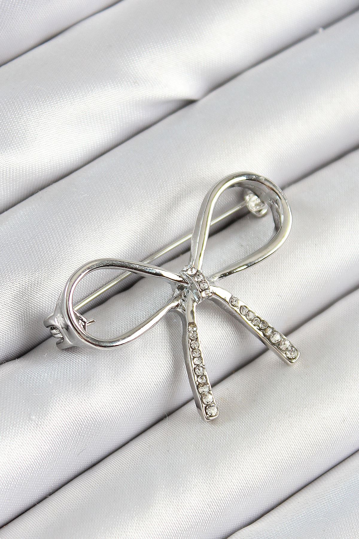 Zirkon Taş Detaylı Fiyonk Figürlü Gümüş Renk Kadın Broş - TJ-BR453