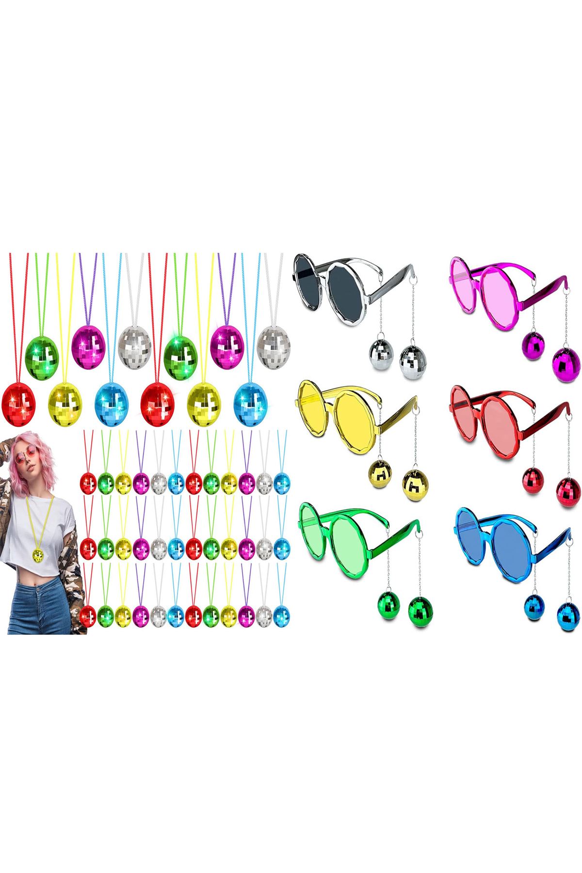 Setin içinde 6 adet parlak renkli disko toplu kolye ve 6 adet uyumlu disko toplu retro gözlük yer alıyor. Her biri canlı renkleri ve 70'ler/80'ler tarzı retro tasarımıyla parti konseptlerine mükemmel uyum sağlar.