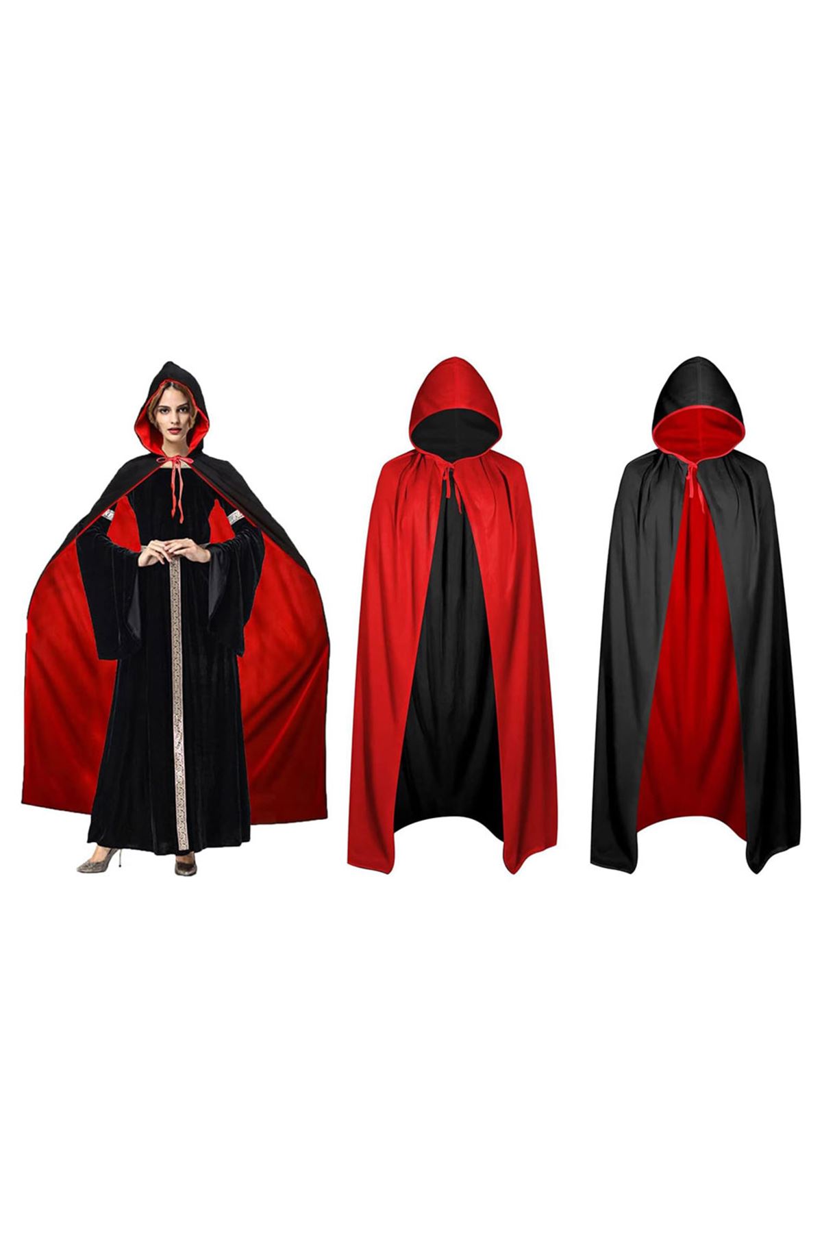 Çift Taraflı Kullanılabilir Siyah Kırmızı Kapişonlu Pelerin 140 cm Yetişkin, kostüm partileri, cosplay veya diğer özel günlerde eğlenceli ve gizemli bir görünüm elde etmek isteyenler için mükemmel bir seçimdir. Siyah ve kırmızı olmak üzere iki farklı rengi ile kullanılabilen bu pelerin, size birçok farklı kostüm seçeneği sunar. Kapüşonu ve uzun boyu ile de gizemli bir hava katacaktır.