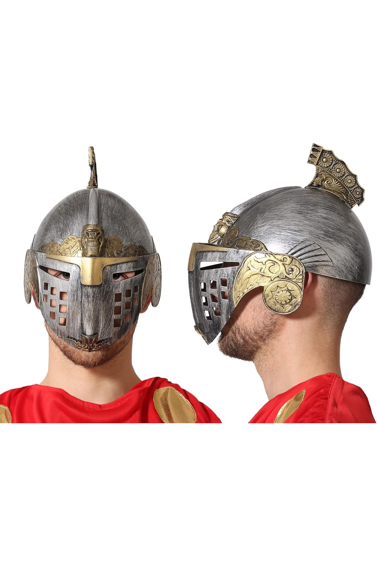 Bu Romalı Bizans kaskı miğferi, Gümüş ve Altın renkleriyle göz alıcı bir görünüme sahiptir. 25x20 cm boyutlarındaki bu miğfer, yetişkinler için standart ölçüdedir ve oynar başlıklıdır.
