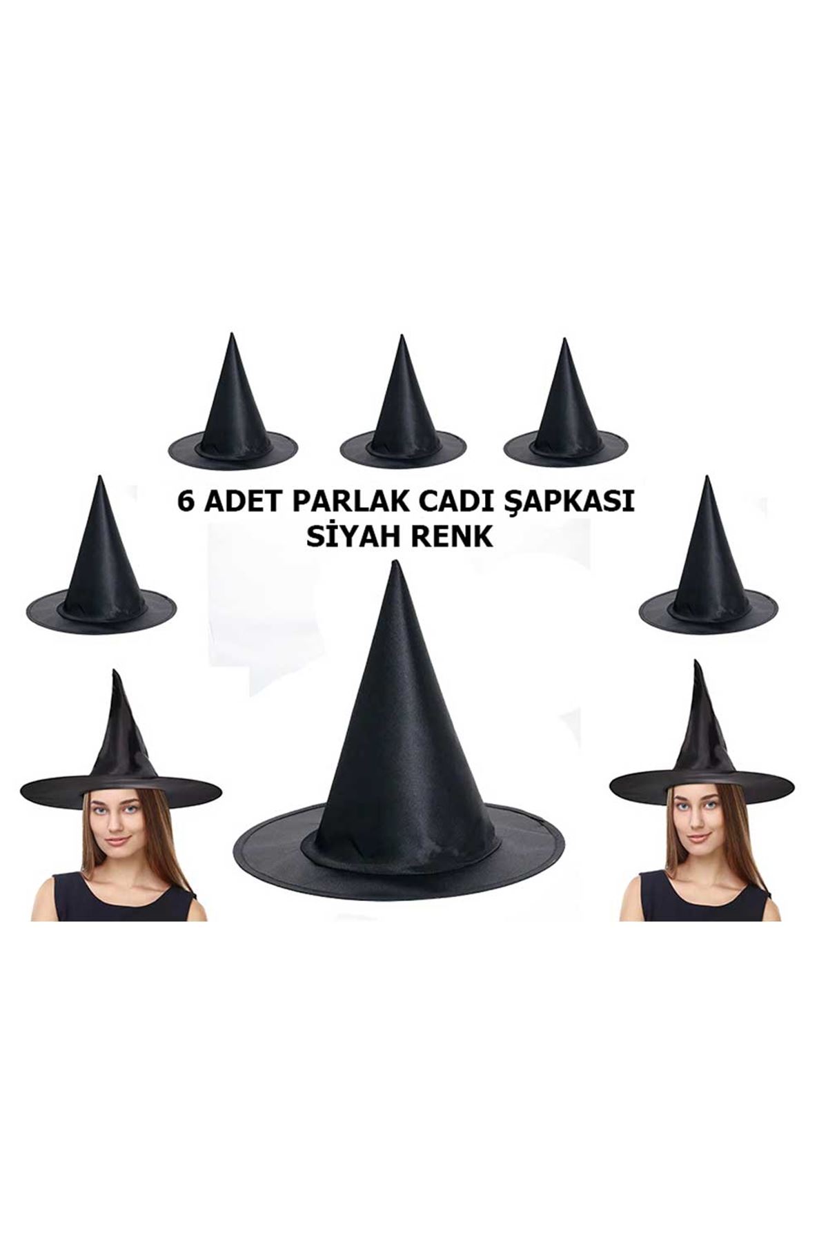 Halloween Siyah Renk Parlak Dralon Cadı Şapkası Yetişkin ve Çocuk Uyumlu 6 Adet