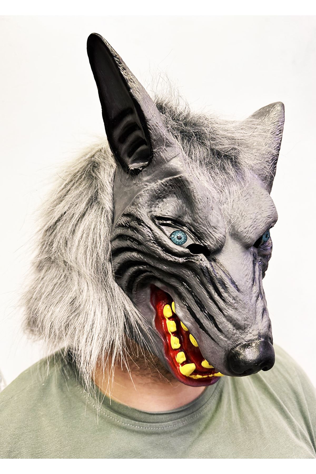Kafaya Tam Geçmeli Lateks Mavi Gözlü Dişli Ağzı Açık Kurt Maskesi