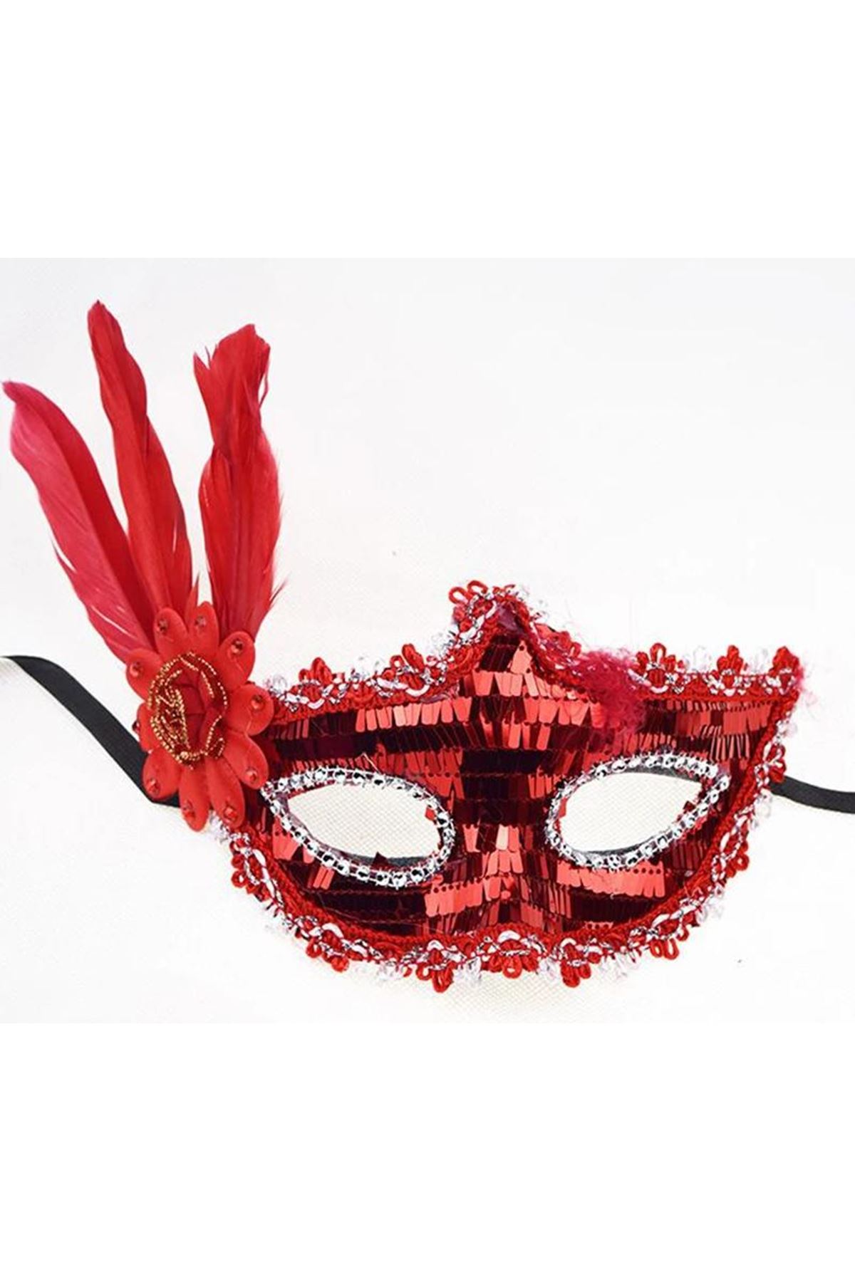 Maskemizin Özellikleri: Kırmızı renk: Tutku ve enerji dolu bir renk. Yandan tüyler: Zarif ve şık bir görünüm için. Parlak payetler: Göz kamaştırıcı bir etki için. Geniş boyut: Yetişkinler için ideal bir uyum (18x22 cm). Rahat kullanım: Yüzünüze rahatça oturur ve uzun süreli kullanımda bile konfor sağlar.