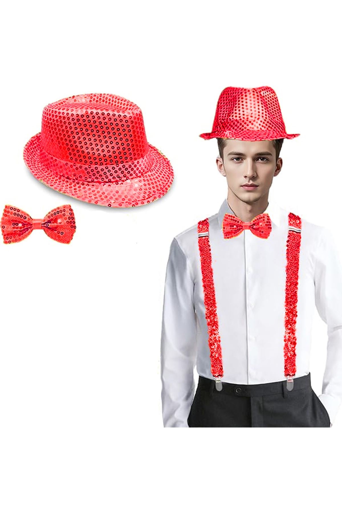 Göz alıcı bir tarz oluşturmak isteyenler için Kırmızı Payetli Şapka ve Papyon Seti tam size göre! Işıltılı tasarımıyla özel davetlerden temalı partilere kadar her ortamda fark yaratın.