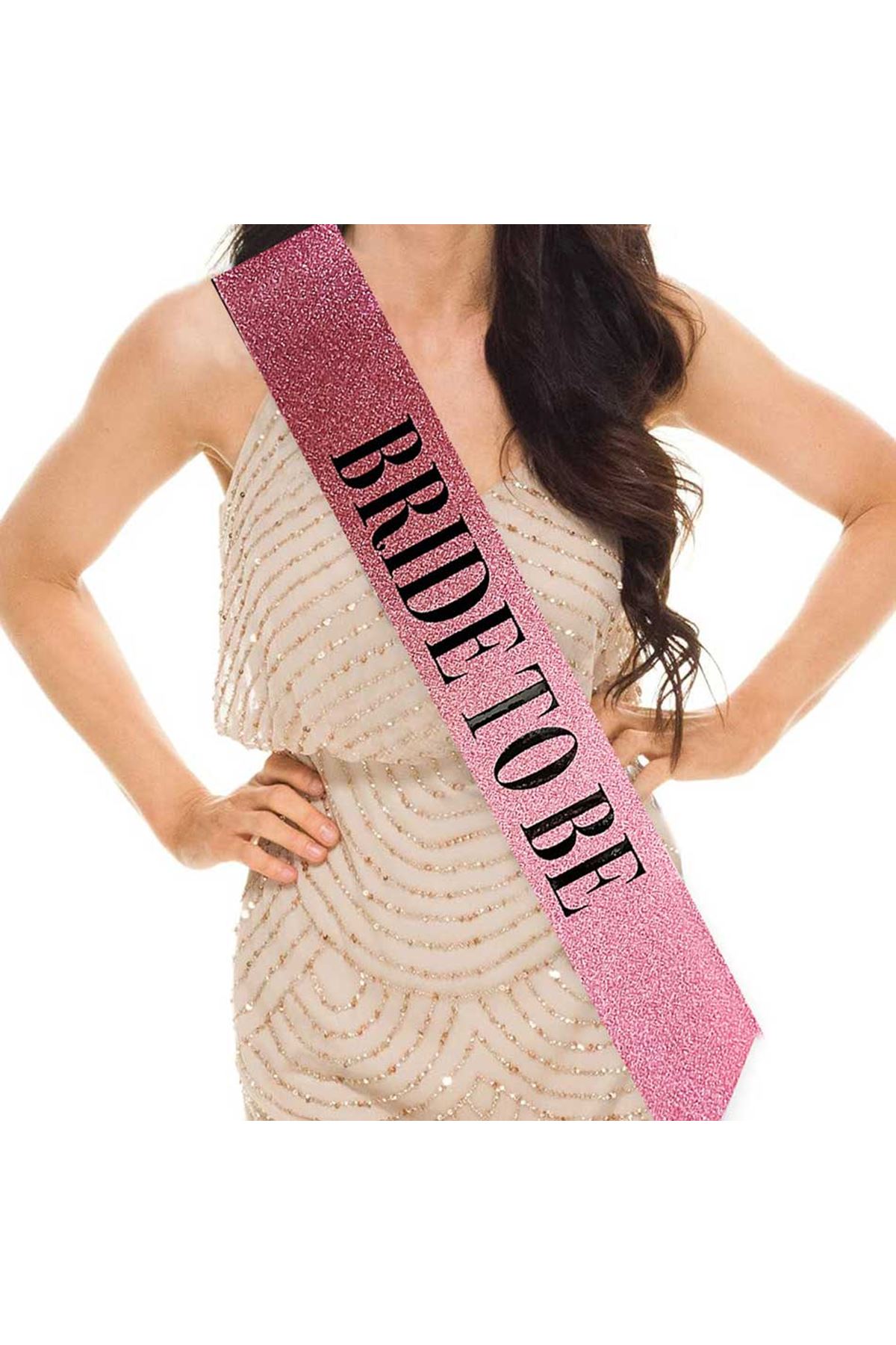 Pembe Üzeri Siyah Kalın "Bride To Be" Yazılı Simli Işıltılı Kuşak Kemer, bekarlığa veda partinizde veya diğer özel günlerde göz alıcı bir aksesuar olmak için mükemmel bir seçimdir. Bu şık ve zarif kemer, her kıyafete ışıltı ve kişilik katacaktır.