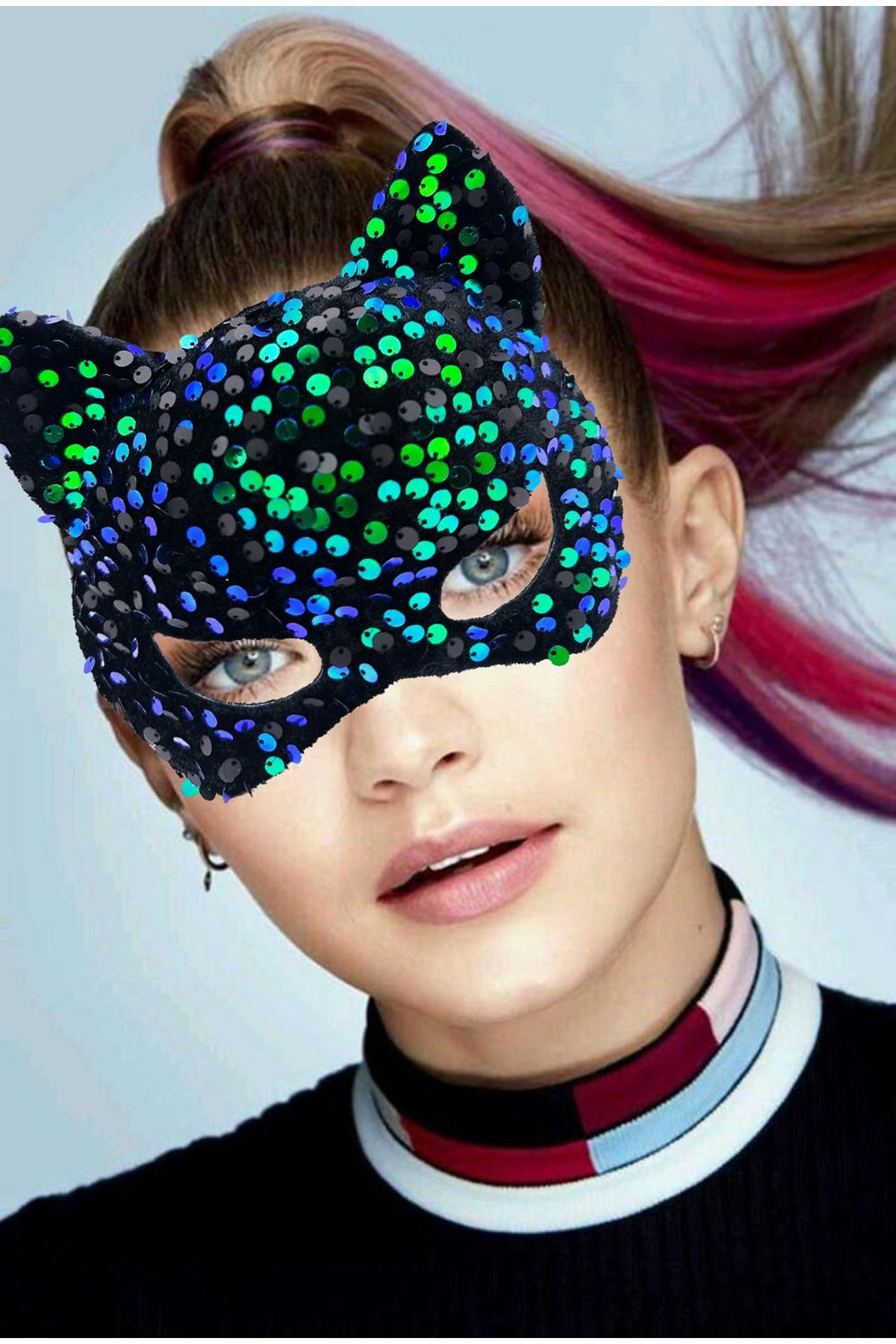 Ürün Adı: Siyah Kadife Kumaş Üzerine Mavi Yeşilli Payetli Pullu Parti Maskesi