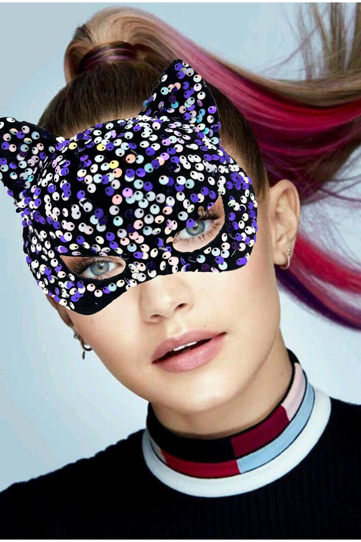 Ürün Adı: Siyah Kadife Kumaş Üzerine Mor Beyaz Payetli Pullu Parti Maskesi