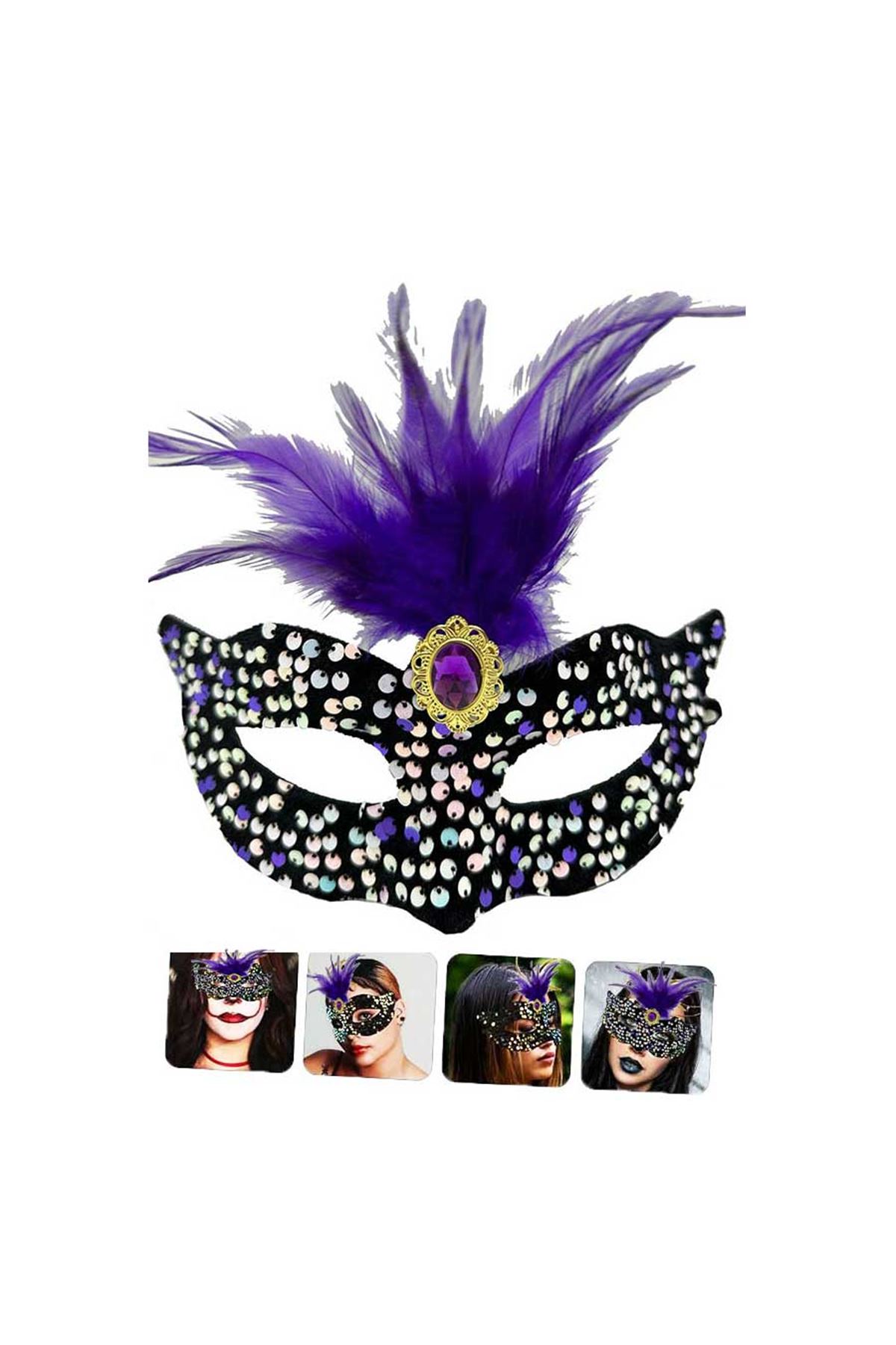 Karnavalda, baloda veya maskeli baloda göz kamaştırmak mı istiyorsunuz? Siyah Kadife Üzeri Rengarenk Payetli Pullu Mor Tüylü Mor Taşlı Parti Maskesi ile gecenin yıldızı siz olun!