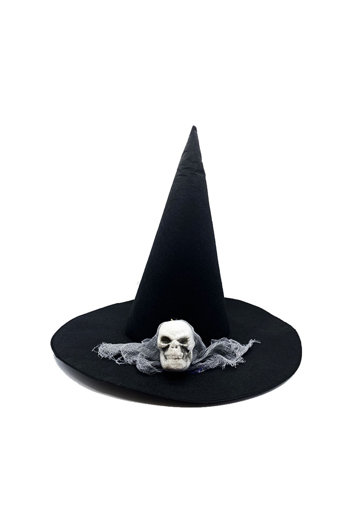 Siyah Renk Gri Duvaklı Kuru Kafa Temalı Cadı Şapkası 35x38 cm