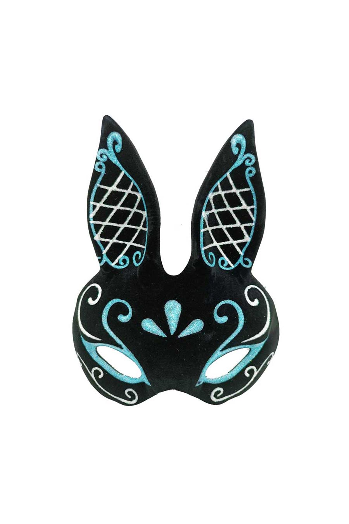 Gizemli ve büyüleyici bir görünüm için siyah süet kaplama, mavi beyaz simli tavşan maskemiz tam size göre!
