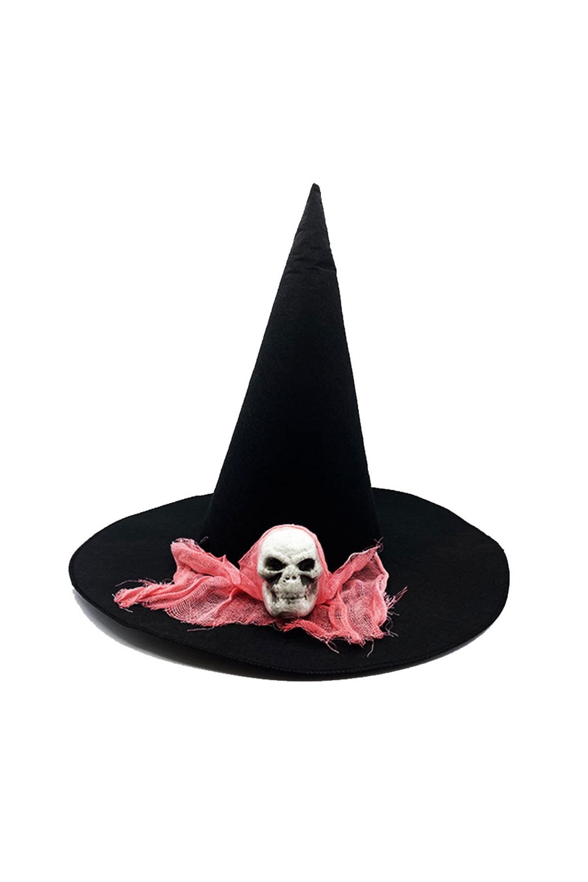 Siyah Renk Kuru Kafa Görselli Cadı Şapkası