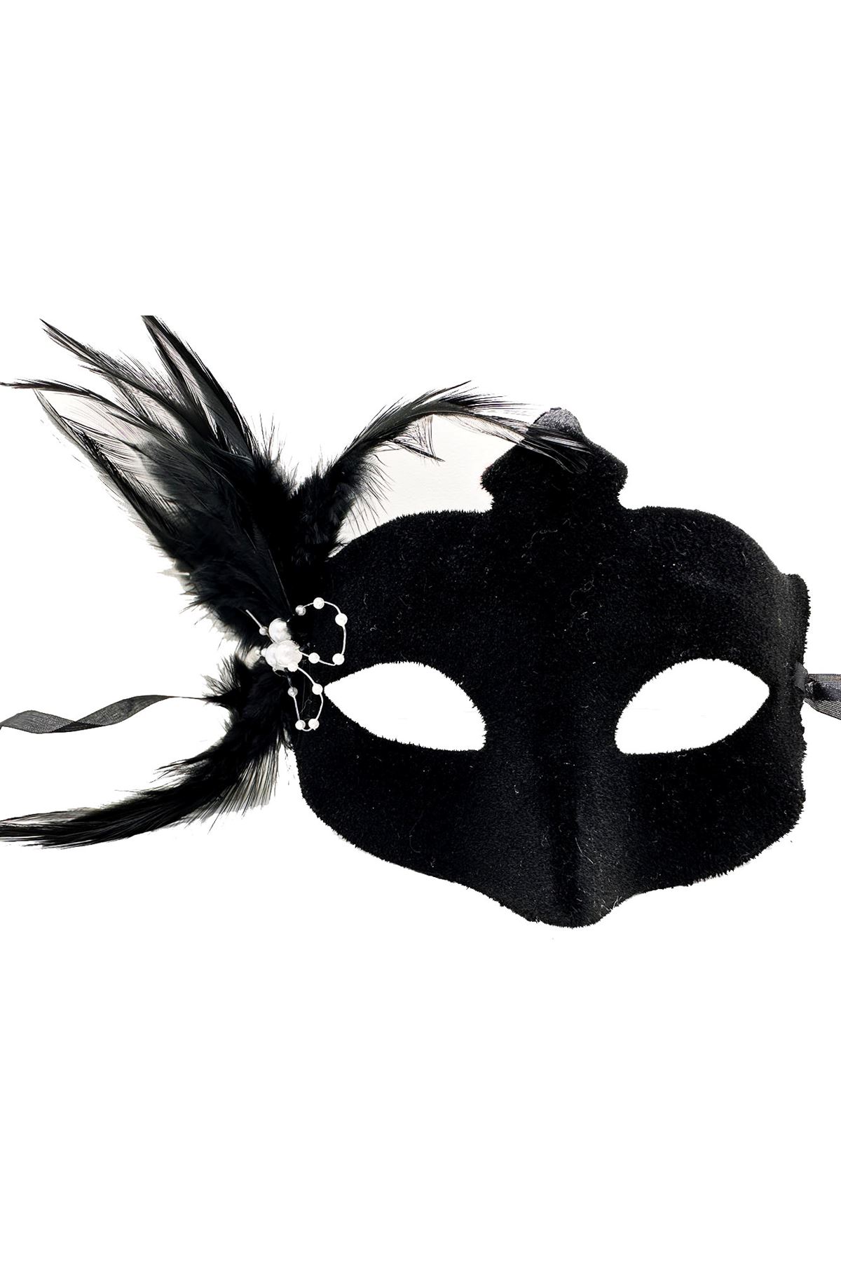 Siyah Renk Yandan Tüylü Süet Kaplama Beyaz İncili Parti Maskesi, balolar, maskeli partiler gibi özel günlerde gizemli ve göz alıcı bir görünüm elde etmek isteyenler için mükemmel bir seçimdir. Yumuşak süet kaplaması ve zarif beyaz incileri ile bu maske sizi partinin yıldızı yapacak.