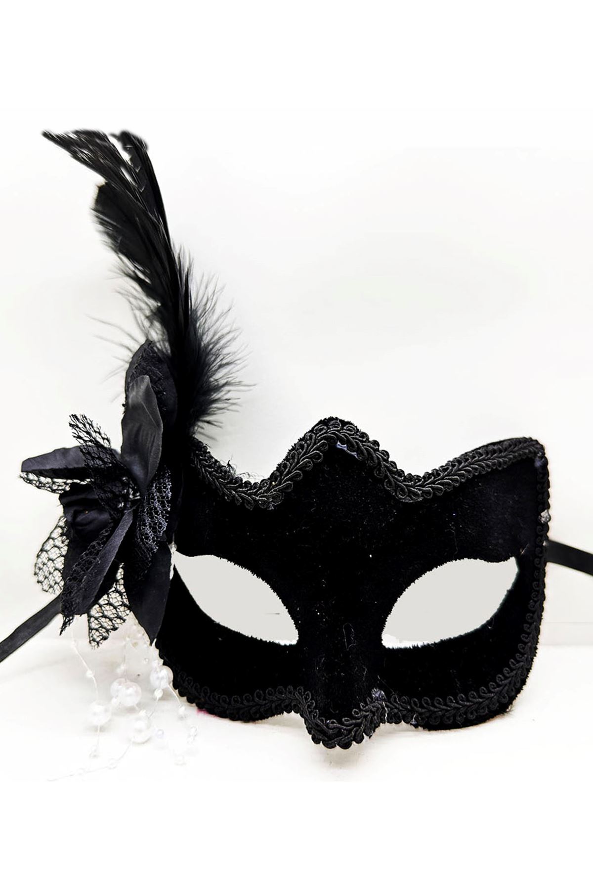 Siyah Renk Süet Kaplama Yandan Tüylü Beyaz İncili Parti Maskesi, balolar, maskeli partiler gibi özel günlerde gizemli ve göz alıcı bir görünüm elde etmek isteyenler için mükemmel bir seçimdir. Yumuşak süet kaplaması ve zarif beyaz incileri ile bu maske sizi partinin yıldızı yapacak.