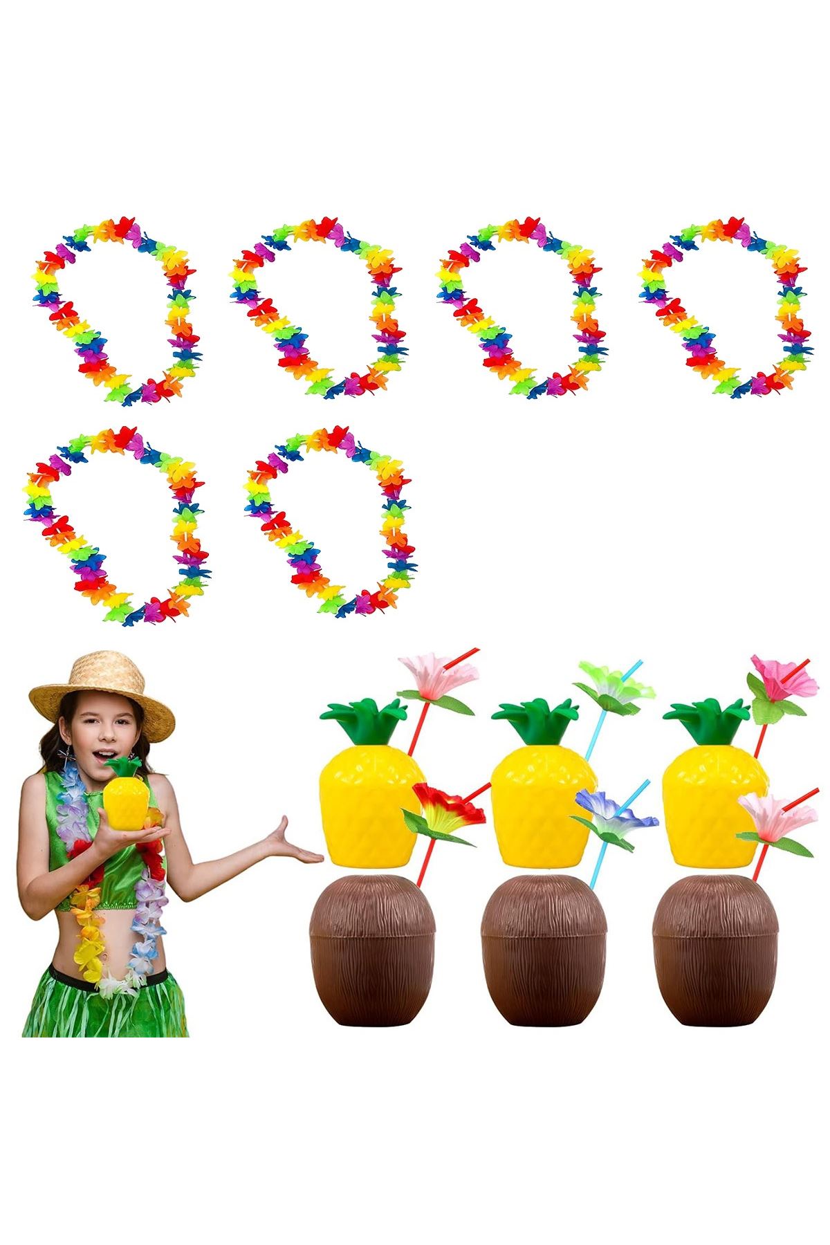 6 Adet Renkli Hawaii Çiçek Kolyesi 3 Adet Ananas Şeklinde İçecek Kabı 3 Adet Hindistan Cevizi Şeklinde İçecek Kabı 6 Adet Hawaii Konsept Renkli Pipet