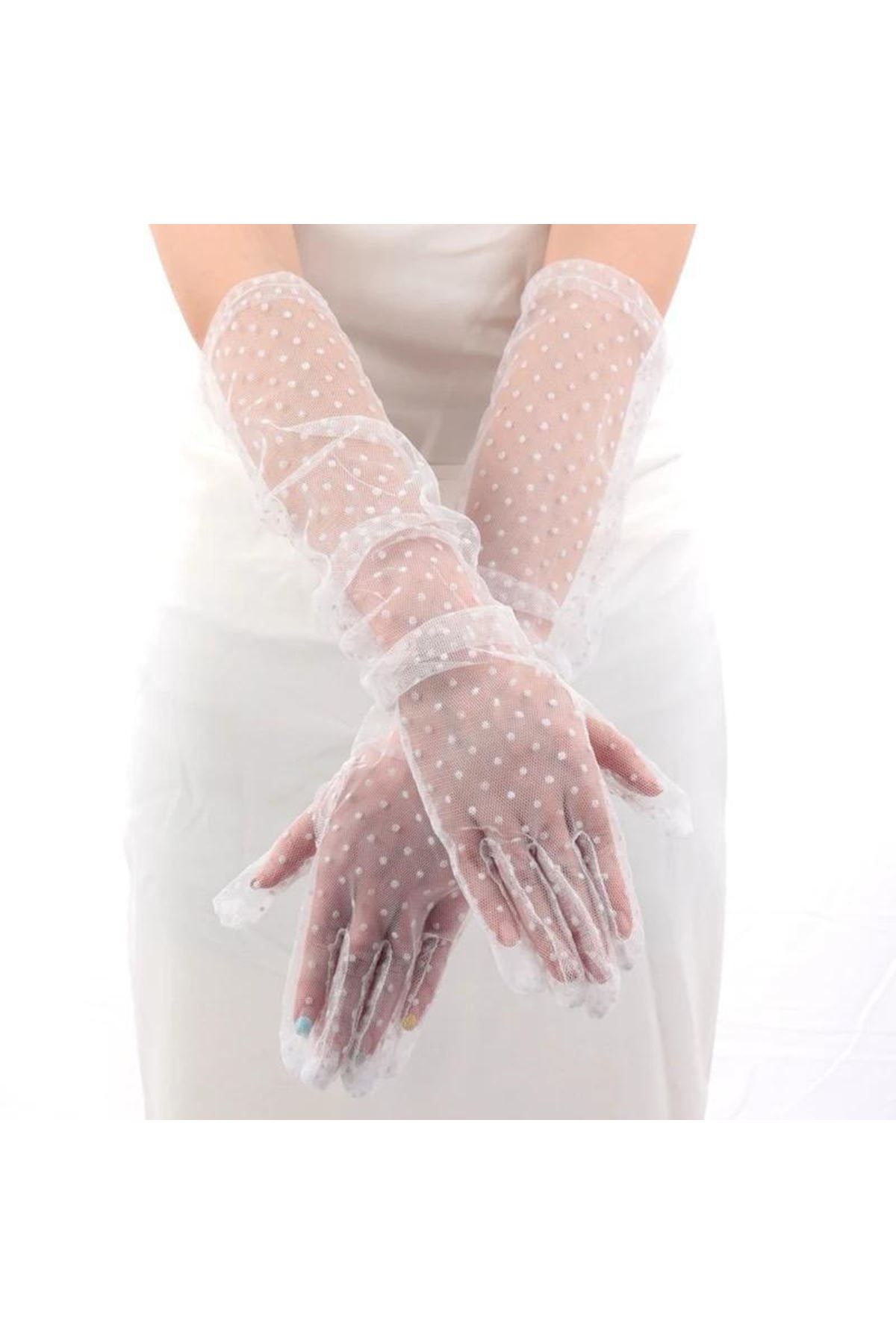 Uzun Boy Beyaz Puantiyeli Beyaz Renk Tül EldivenÜrün Ölçüsü : 55 CmYetişkinler Için UygundurKaliteli Tül Malzemeden Üretilmiştir Ithal Üründür