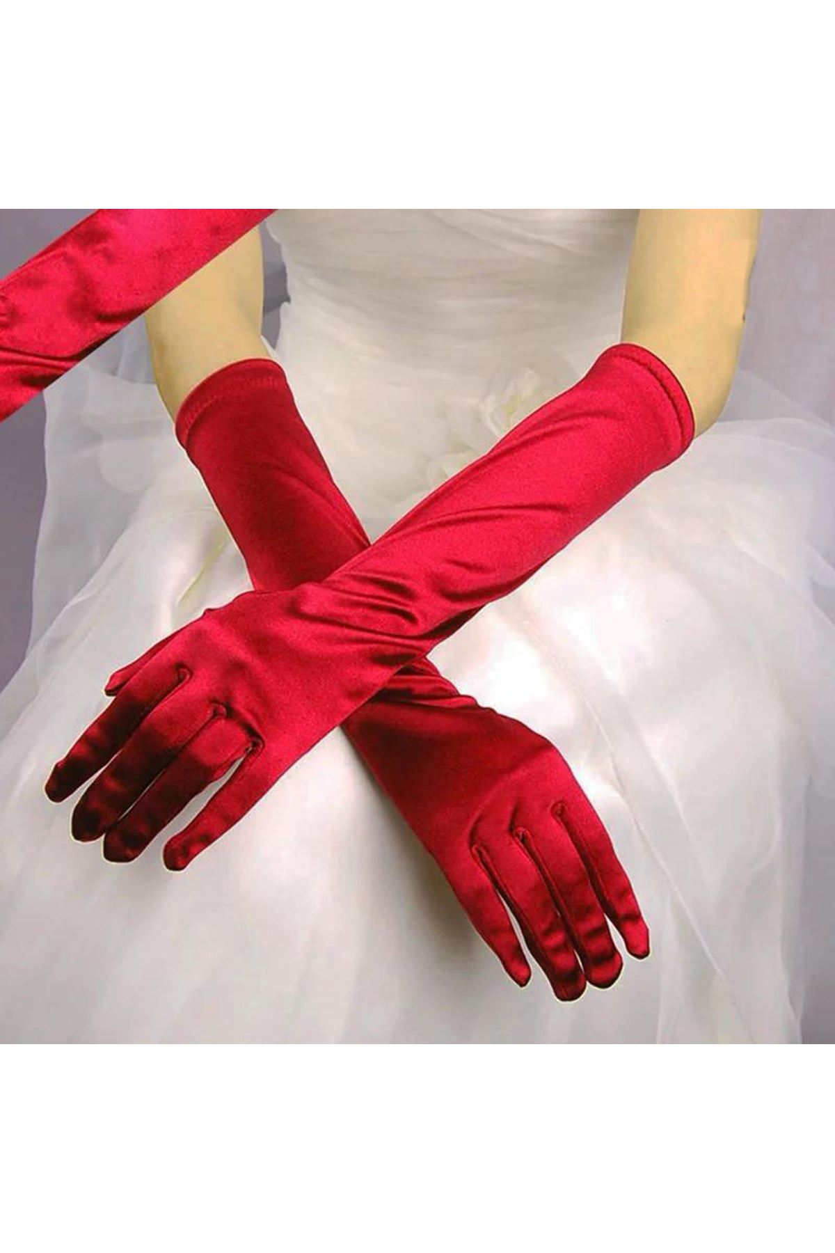 Uzun Boy Ekstra Parlak Saten Eldiven Kırmızı Renk